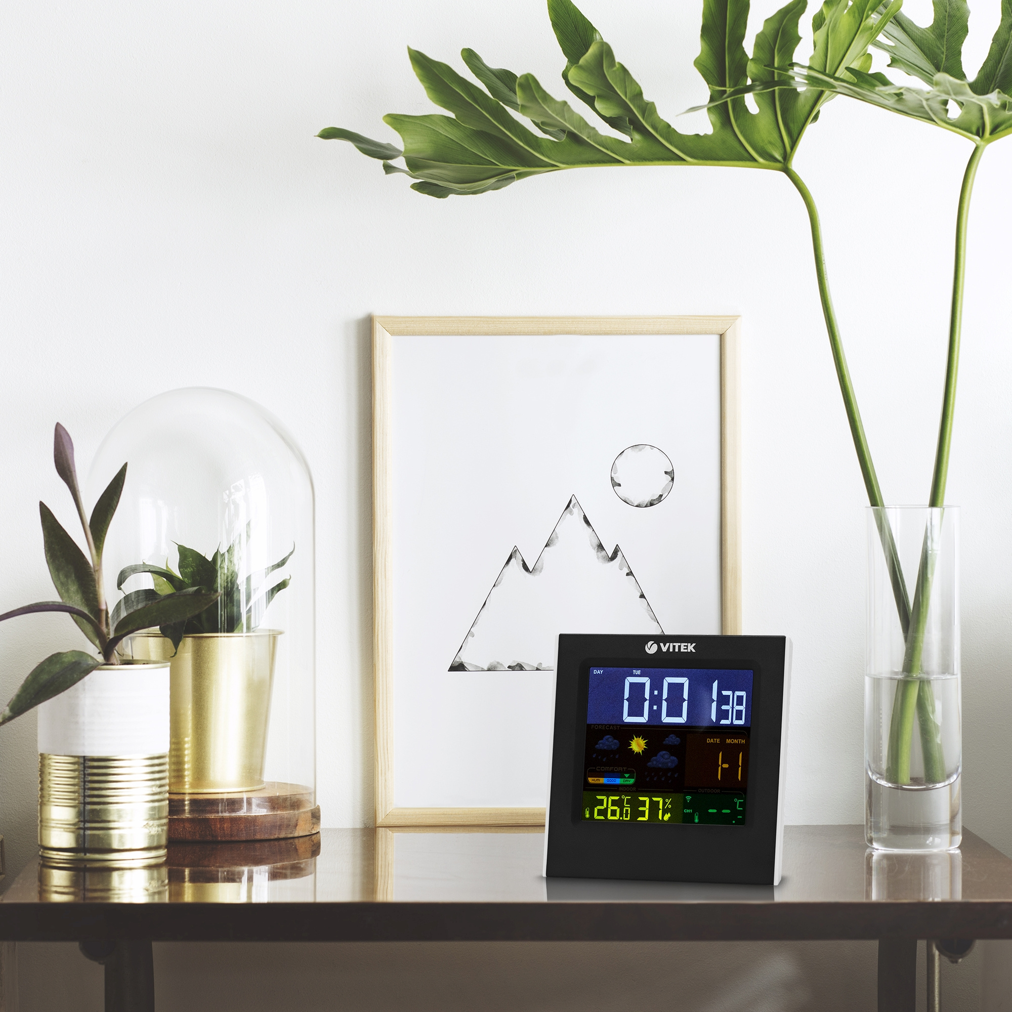 Чтобы узнать прогноз погоды необязательно включать телевизор или проверять смартфон. Беспроводная метеостанция VT-6411 отображает всю информацию на цветном дисплее: температуру в комнате и на улице, а также влажность воздуха в доме. В верхней части метеостанции размещены часы с функцией будильника со спящим режимом, а также удобный календарь, который напомнит вам, какое сегодня число. По желанию температура может отображаться в градусах по Фаренгейту или Цельсию. Прогноз погоды представлен в виде информативных иконок, дополненных индикатором комфортности: "сухо", "влажно" или " нормально".