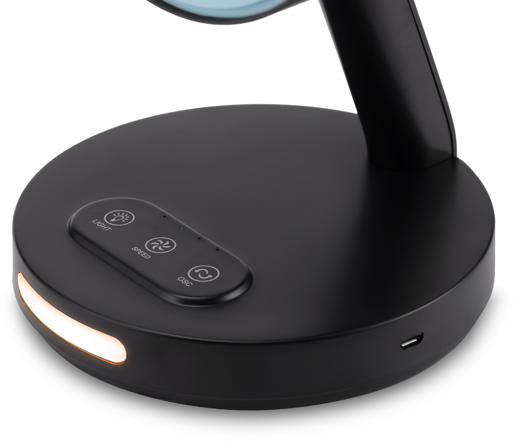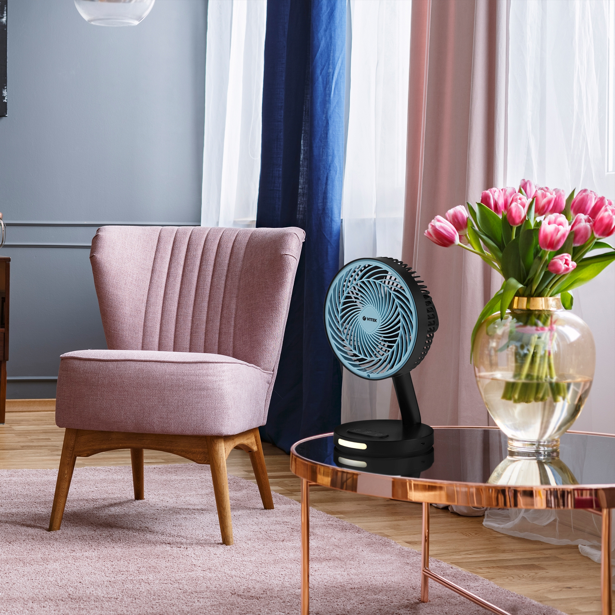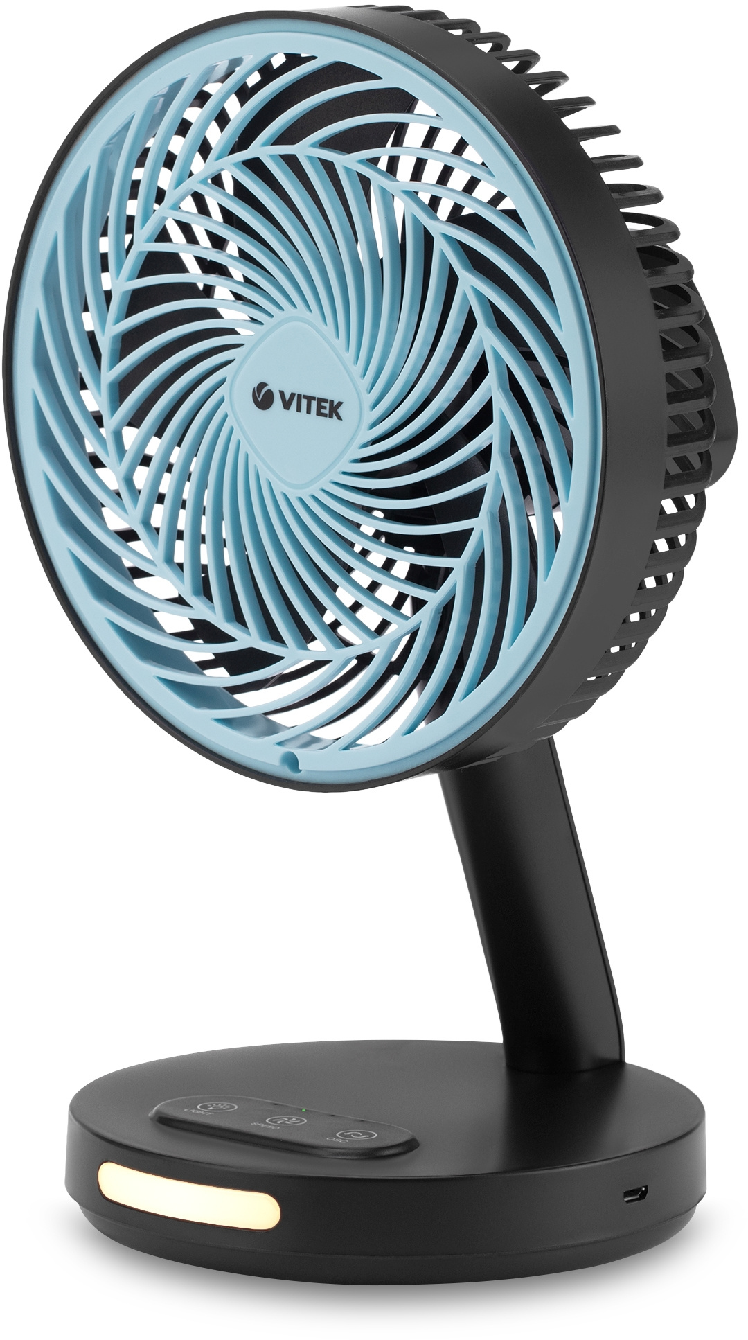 Создать комфортный микроклимат в небольшом помещении даже в самый жаркий день способен настольный пятилопастный вентилятор VITEK VT-2072 диаметром 14 см (5,5"). Номинальная потребляемая мощность устройства — 10 Вт. Вентилятор имеет красивую LED-подсветку, которая делает его использование особенно комфортным. В приборе предусмотрены три скоростных режима работы (H, M, L): выбрать необходимый можно на сенсорной панели управления. Обязательно отрегулируйте угол поворота вентилятора — в стороны на 35° или вверх/вниз на 45°, чтобы охлаждение воздуха происходило эффективнее. Прибор абсолютно безопасен в использовании: его лопасти скрыты за двусторонней защитной решеткой. Работает устройство от двух аккумуляторных батарей Li-Ion (3,7 В, 2000 мАч). Заряжать прибор можно через порт USB. Купите настольный вентилятор VITEK VT-2072 и наслаждайтесь летом в полной мере!