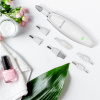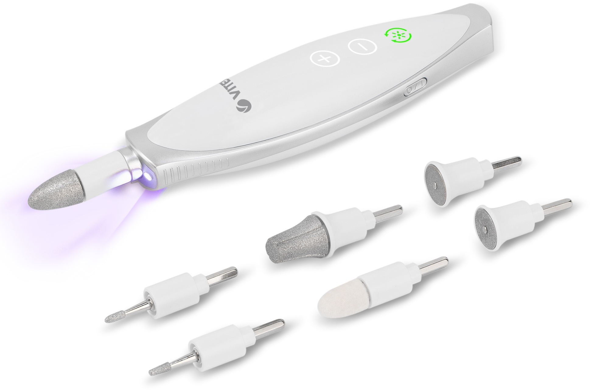 Профессиональный прибор для маникюра и педикюра. Насадки с сапфировым и фетровым покрытиями подпилят, придадут форму и отшлифуют ногти. Регулируйте скорость, включайте LED-подсветку и берите устройство в путешествие — в комплект входит вместительный кейс на молнии.