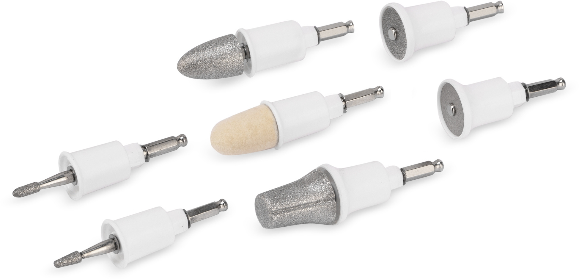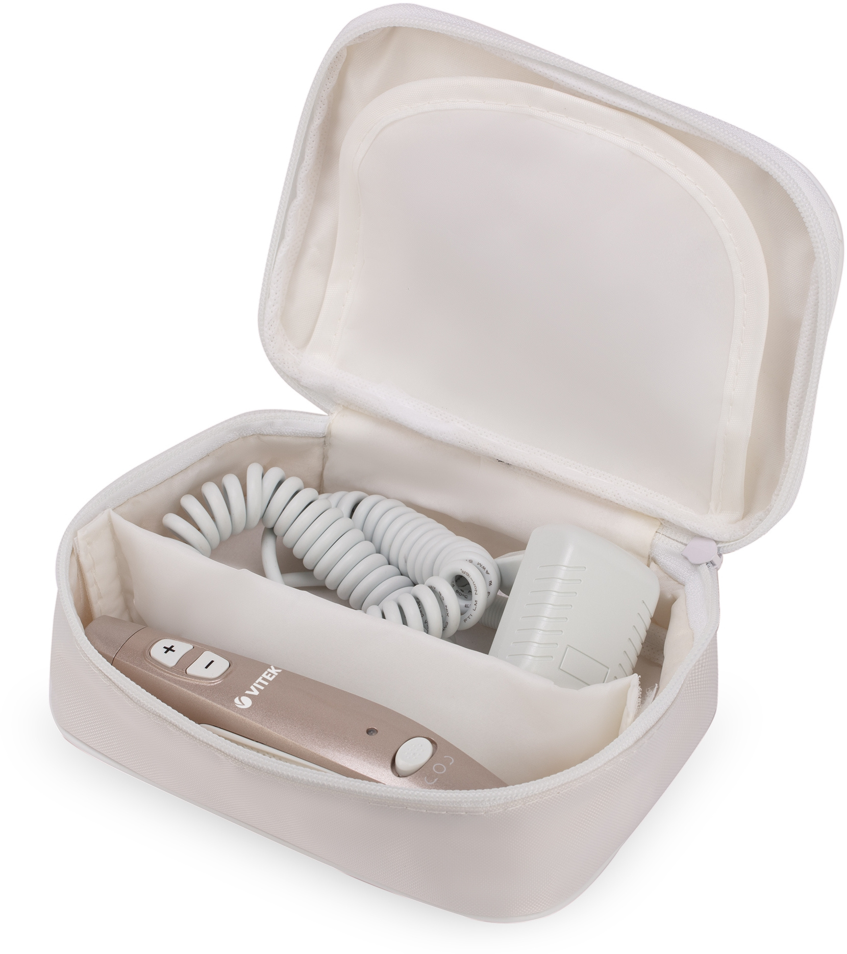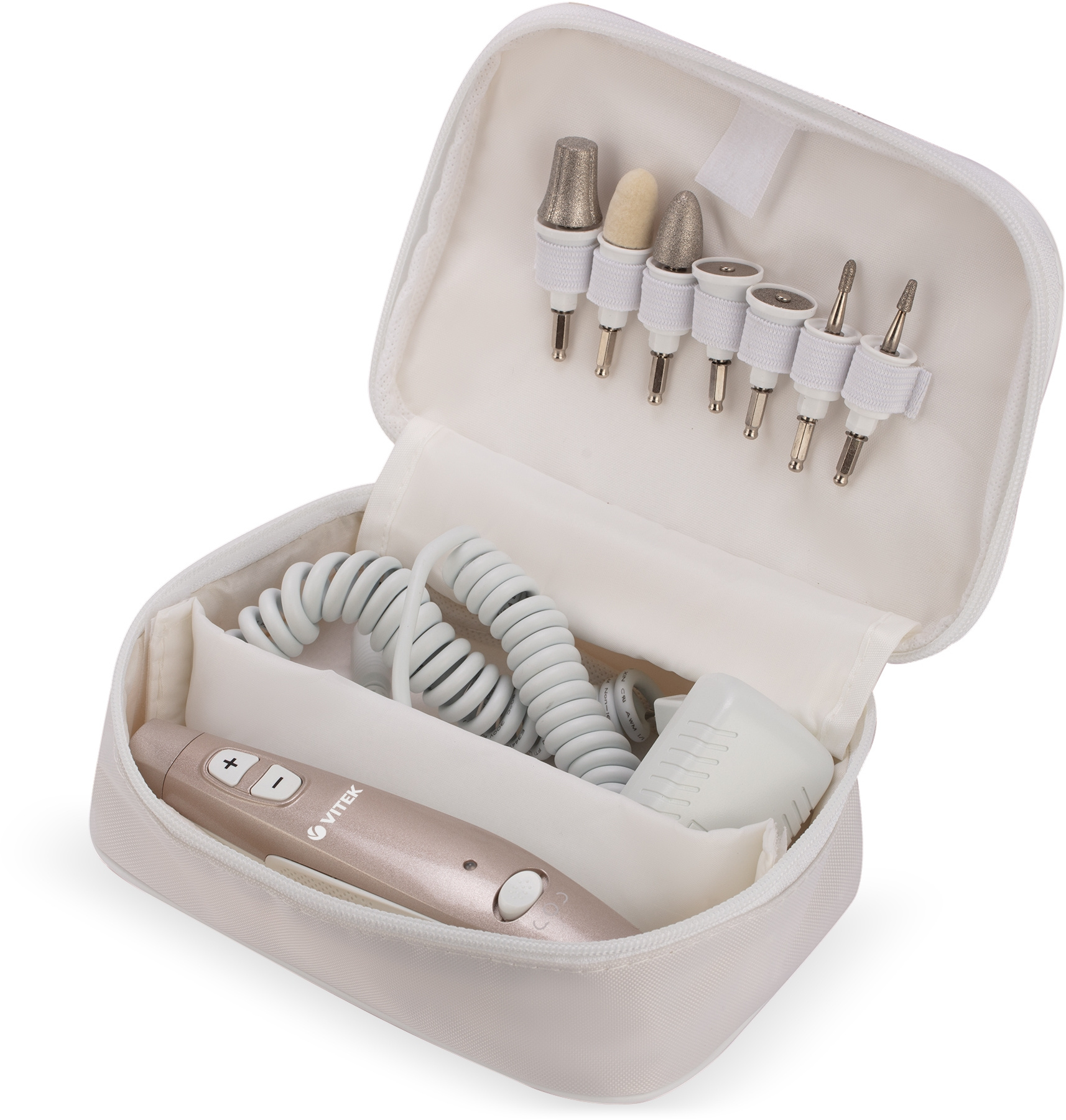 Набор для маникюра и педикюра VITEK VT-2214 GD – это профессиональный уход за ногтями у вас дома. Семь различных насадок помогут вам получить результат не хуже, чем в салоне. Малая конусная насадка подойдет для обработки ногтей и рук, и ног. Используйте насадку для удаления грубой кожи, чтобы обработать пятки и удалить мозоли, а диски – для придания ногтям формы. Остроконечная насадка справится с огрубевшей кожей и поможет с проблемой вросшего ногтя. Большая конусная насадка отлично подойдет для шлифовки ногтей и участков с грубой кожей, а фетровый конус отполирует поверхность ногтей и придает им дополнительный блеск. LED подсветка поможет лучше видеть обрабатываемые участки, а кейс на молнии – удобно хранить ваш миниатюрный маникюрный салон и даже брать его с собой в путешествия.