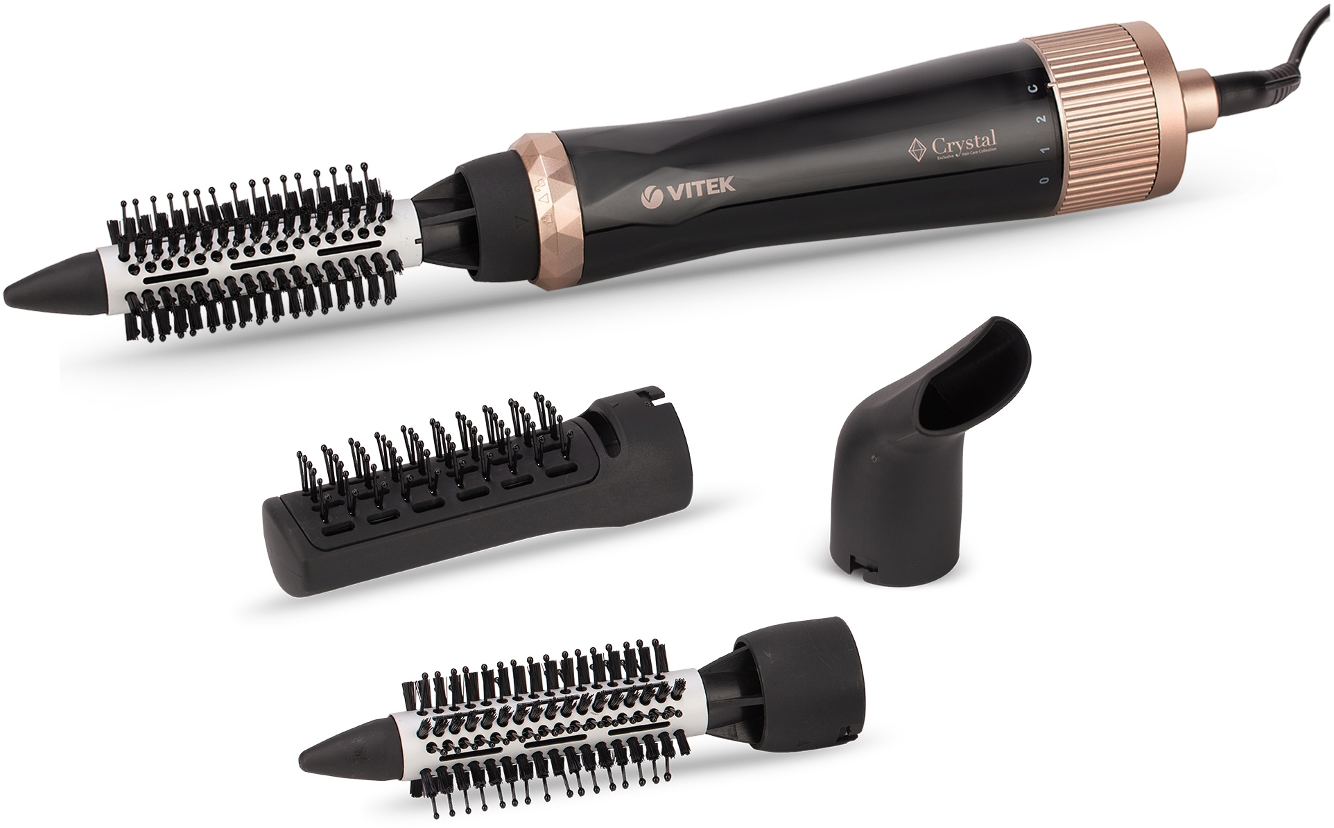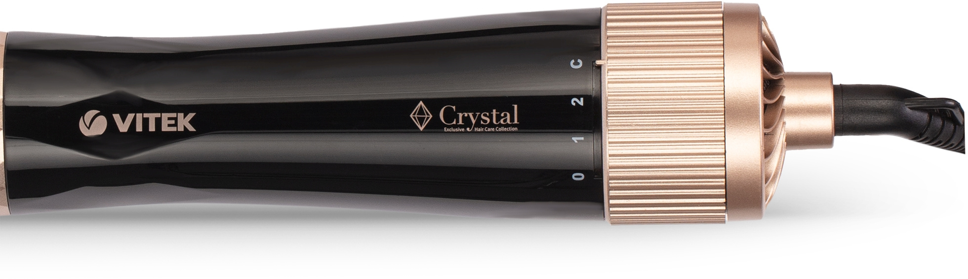 Фен-щетка VITEK VT-8243 – яркий представитель эксклюзивной коллекции Crystal, в которую также входят фен и выпрямитель. Прибор мощностью 1000 Вт в стильном корпусе с элементами, напоминающими грани кристалла, имеет два режима работы и три насадки: термощетка 20 мм, плоская щетка и концентратор. Модель оснащена технологией Tourmaline Ionic для более гладких и блестящих волос.