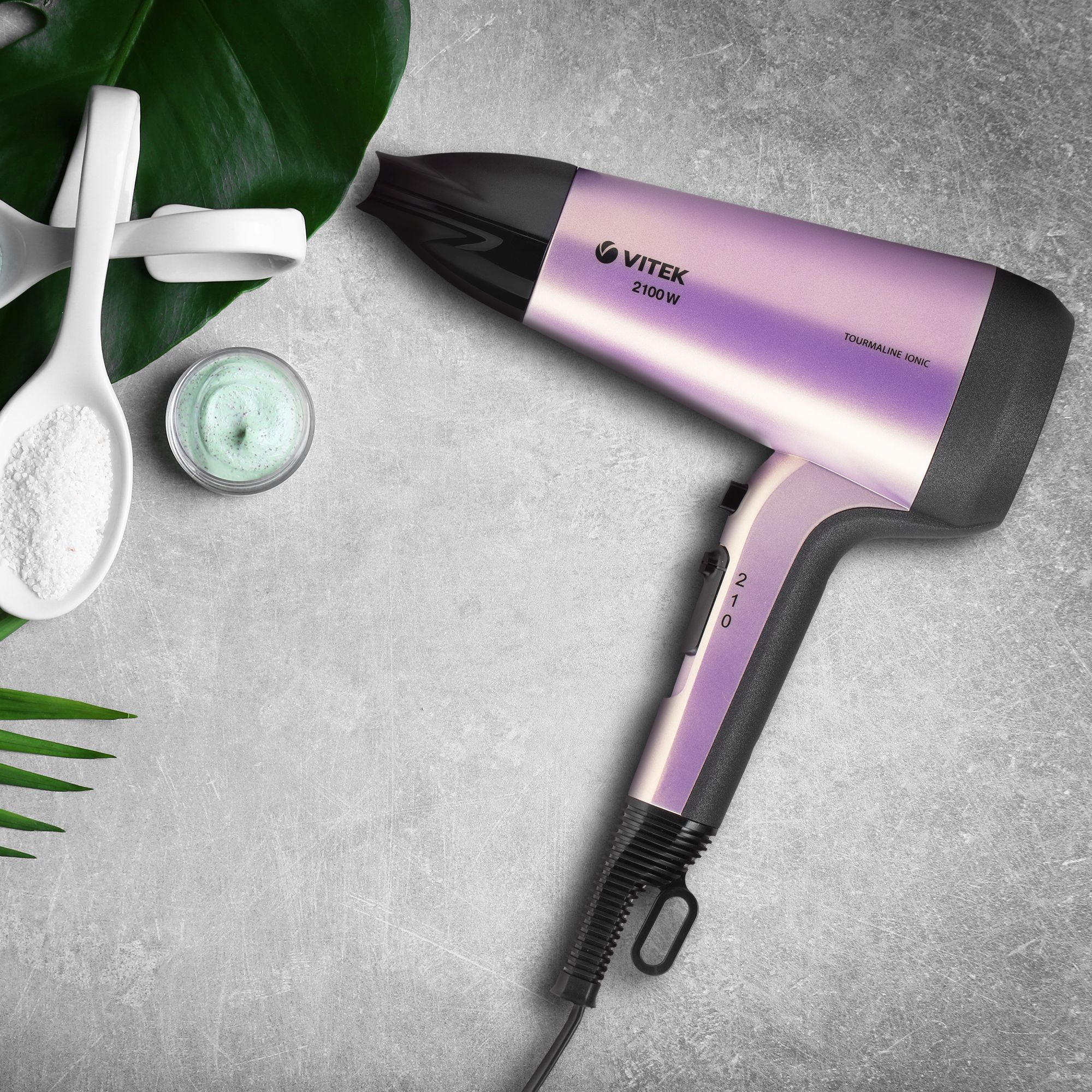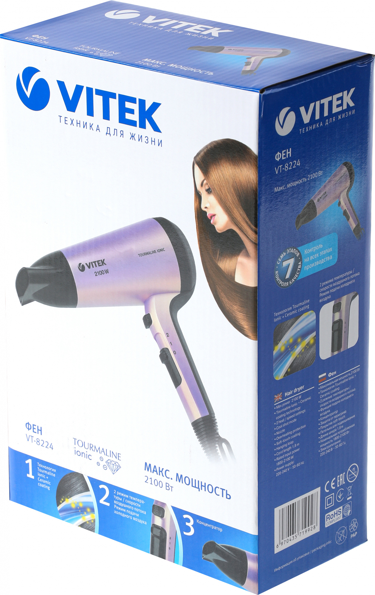Фен VITEK VT-8224 в розовом перламутровом корпусе сделает уход за волосами еще более бережным. Специальное покрытие решетки Tourmaline Ionic при нагревании создает поток отрицательных ионов, которые закрывают волосяные чешуйки, делая волосы гладкими и блестящими. Фен обладает высокой мощностью в 2100 Вт, имеет два режима регулировки температуры и скорости воздушного потока, функцию подачи холодного воздуха и насадку-концентратор – и это всё, что нужно для создания идеальной укладки.