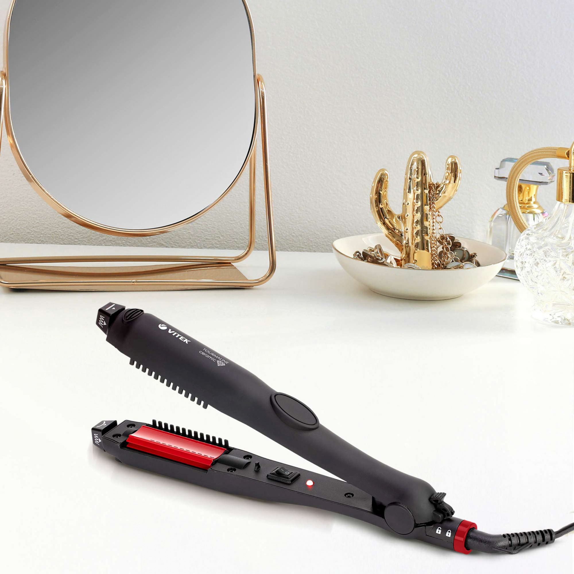 Тем, кто любит менять свой облик, создавая разнообразные прически, подойдет мультистайлер VITEK VT-8437. Для этого прибора 4 в 1 практически нет ничего невозможного в мире парикмахерского искусства! Он способен выпрямить волосы, завить их в мелкое или крупное гофре, а также создать эффектные 3D-локоны. Благодаря вращающемуся шнуру, пользоваться прибором очень удобно. Пластины мультистайлера имеют керамическое покрытие Tourmaline Ceramic, которое снимает статическое электричество и «запечатывает» чешуйки волос. Технология PTC Heating позволяет быстро стабилизировать нагрев прибора (максимальная температура — 220°С). В результате вы получаете красивую прическу, а волосы остаются здоровыми и крепкими.