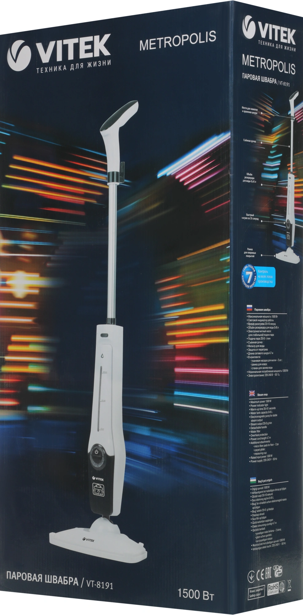 Хотите, чтобы уборка квартиры была легкой и быстрой, а результат восхищал даже самых придирчивых хозяек? Проверьте в деле паровую швабру VITEK 8191-VT-01 с максимальной мощностью 1500 Вт. Этот прибор поможет убирать как гладкий пол (паркет, ламинат, линолеум), так и ковровые покрытия, удаляя стойкие загрязнения и неприятные запахи. Электромагнитный насос обеспечивает стабильную подачу пара (25 г/мин), которая способствует более эффективному очищению поверхности. Резервуар для воды имеет объем 450 мл. Пользоваться паровой шваброй очень удобно, благодаря шнуру длиной 4,7 м. После использования отсоедините съемную ручку прибора и уберите устройство в кладовку или другое небольшое помещение: в таком виде оно займет совсем немного места. Купить паровую швабру VITEK 8191-VT-01 точно захотят те, кто любит делать свою жизнь максимально комфортной.