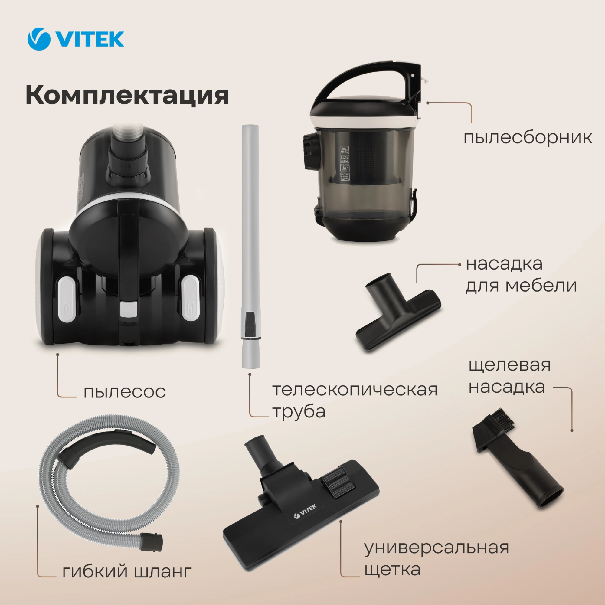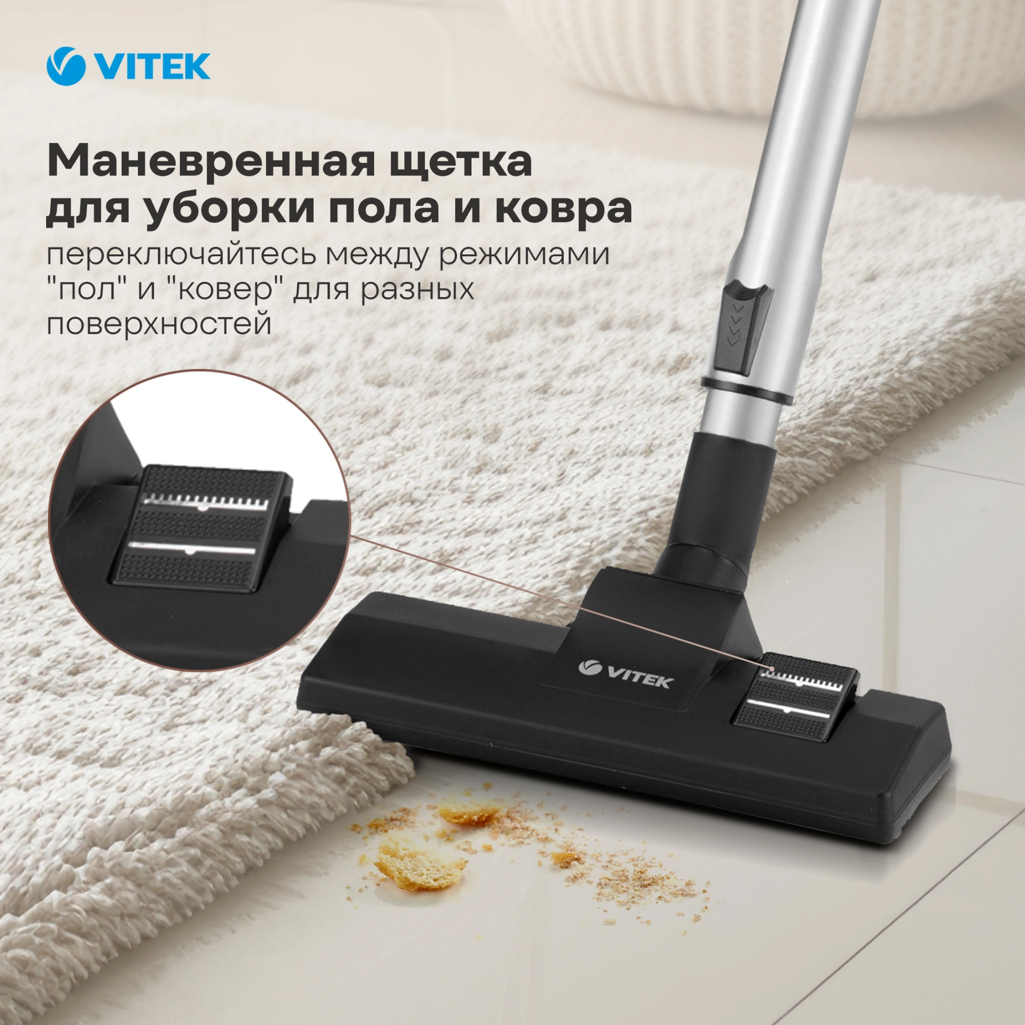 Провести быструю и эффективную уборку в квартире поможет компактный пылесос с контейнером для сбора пыли VITEK VT-8142. Его максимальная потребляемая мощность составляет 1500 Вт, а мощность всасывания — 200 Вт. Устройство имеет мощный HEPA-фильтр, который задерживает мельчайшие частицы микроорганизмов и аллергенов, обеспечивая идеальную чистоту воздуха в помещении. Наличие металлической телескопической трубки, а также ножного переключателя щетки «Пол/Ковер» делает взаимодействие с ним удивительно комфортным. Перемещать пылесос в процессе уборки очень легко благодаря удобной ручке для переноски, а специальная кнопка на корпусе позволит смотать шнур за считаные секунды.