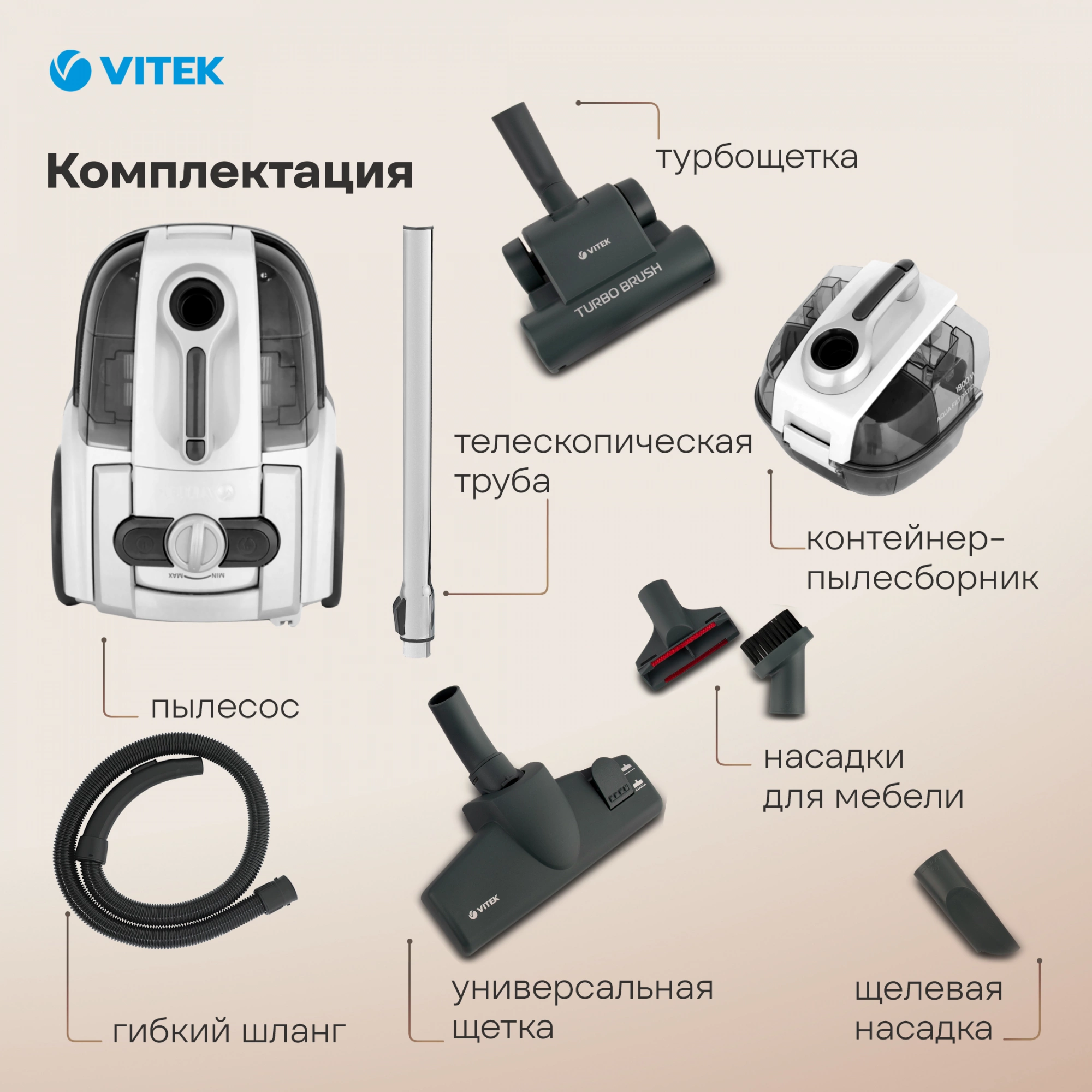 Пылесос с контейнером Vitek VT-1833 PR комплектуется телескопической трубкой, турбощеткой и щелевой насадкой — всё необходимое для ухода за полами, коврами, плинтусами и мебелью. Модель также оснащена индикацией заполнения пылесборника. Возможность отключения одной кнопкой ногой и шнур длиной 5 м делают уборку проще и быстрее.
