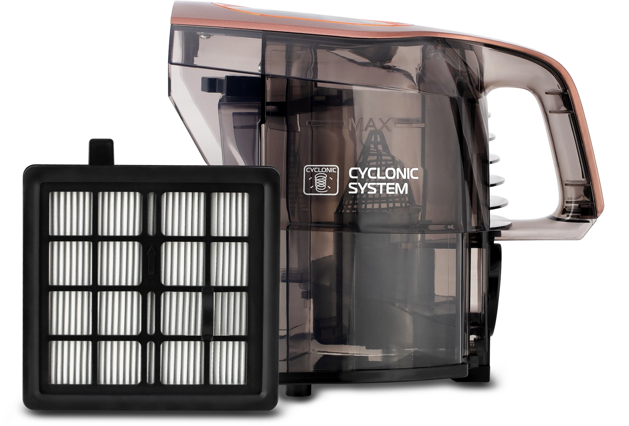 Технология пылесоса с циклонной системой в сочетании с четырехступенчатой фильтрацией обеспечивает надежное разделение частиц пыли от воздуха. В конструкции предусмотрены фильтры грубой и тонкой очистки, моторный фильтр и HEPA-фильтр. Такая система делает модель отличным выбором среди пылесосов для аллергиков, эффективно задерживая шерсть животных, пыльцу и микрочастицы.