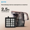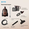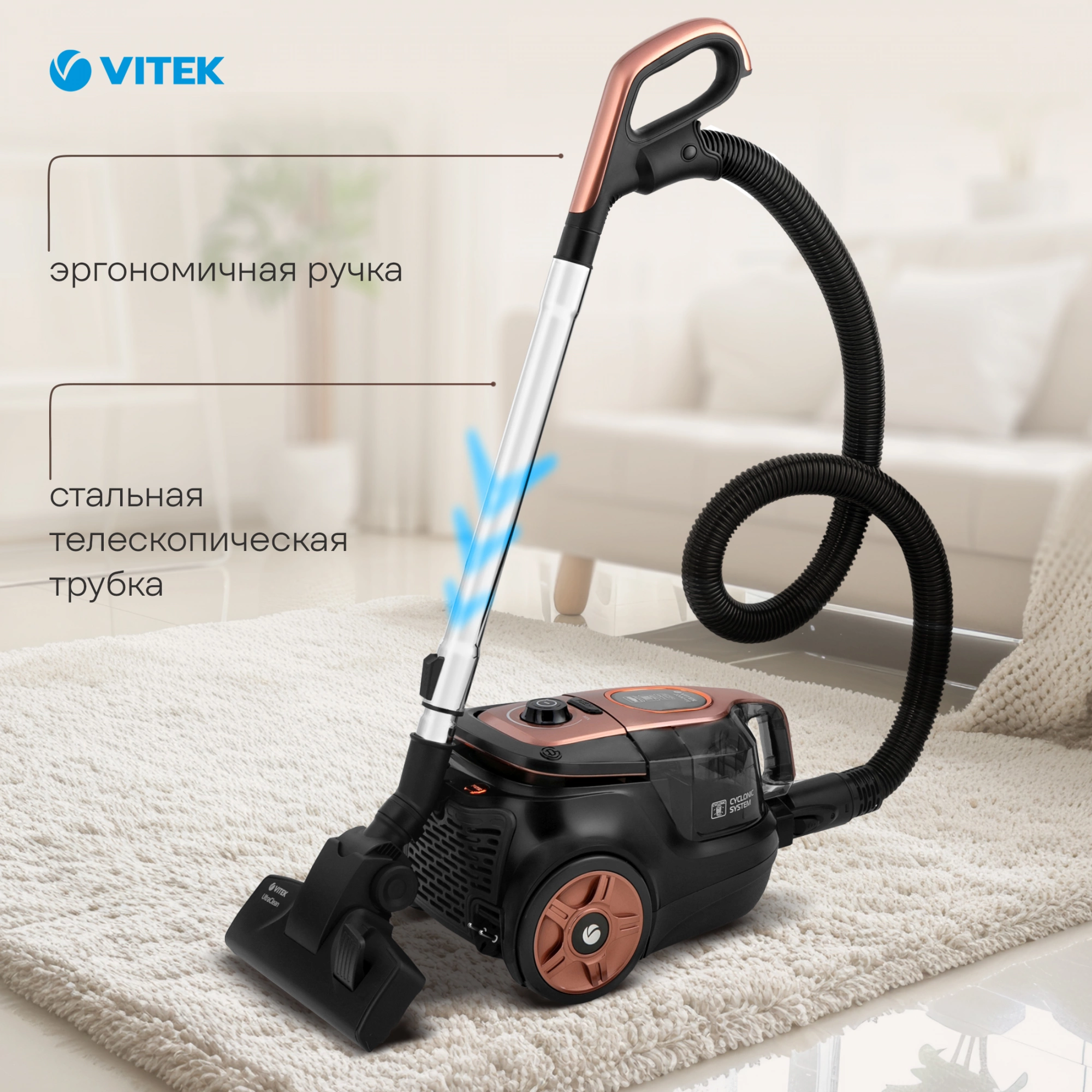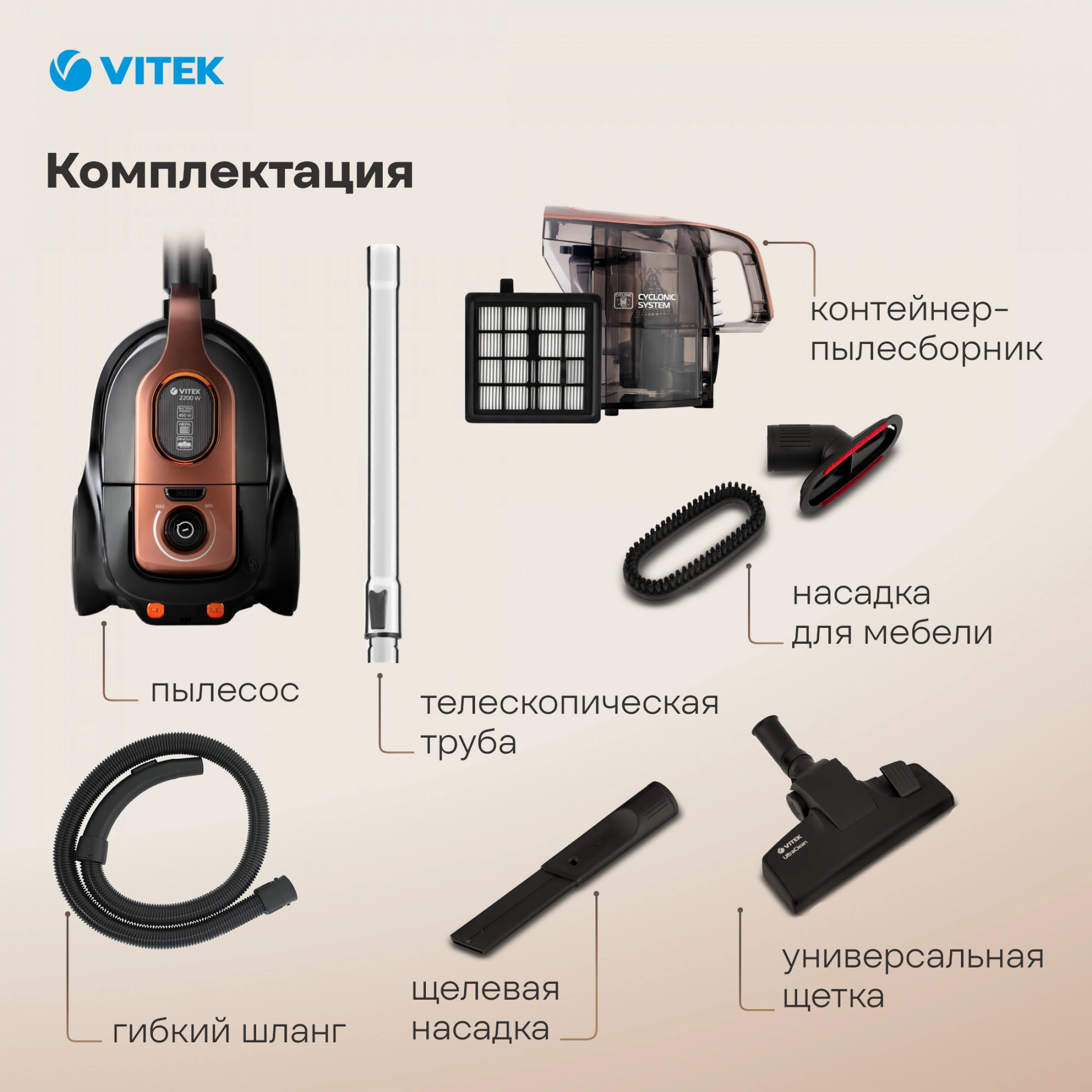 Пылесос Vitek VT-8117 BK — это современное решение для сухой уборки, сочетающее эффективность и продуманный функционал. Благодаря мощному мотору 2200 Вт и силе всасывания до 450 Вт, прибор эффективно справляется с пылью и мусором даже на коврах с ворсом. Вместительный контейнер для пыли объемом 2.5 л позволяет проводить уборку без частой очистки, что делает использование удобным.