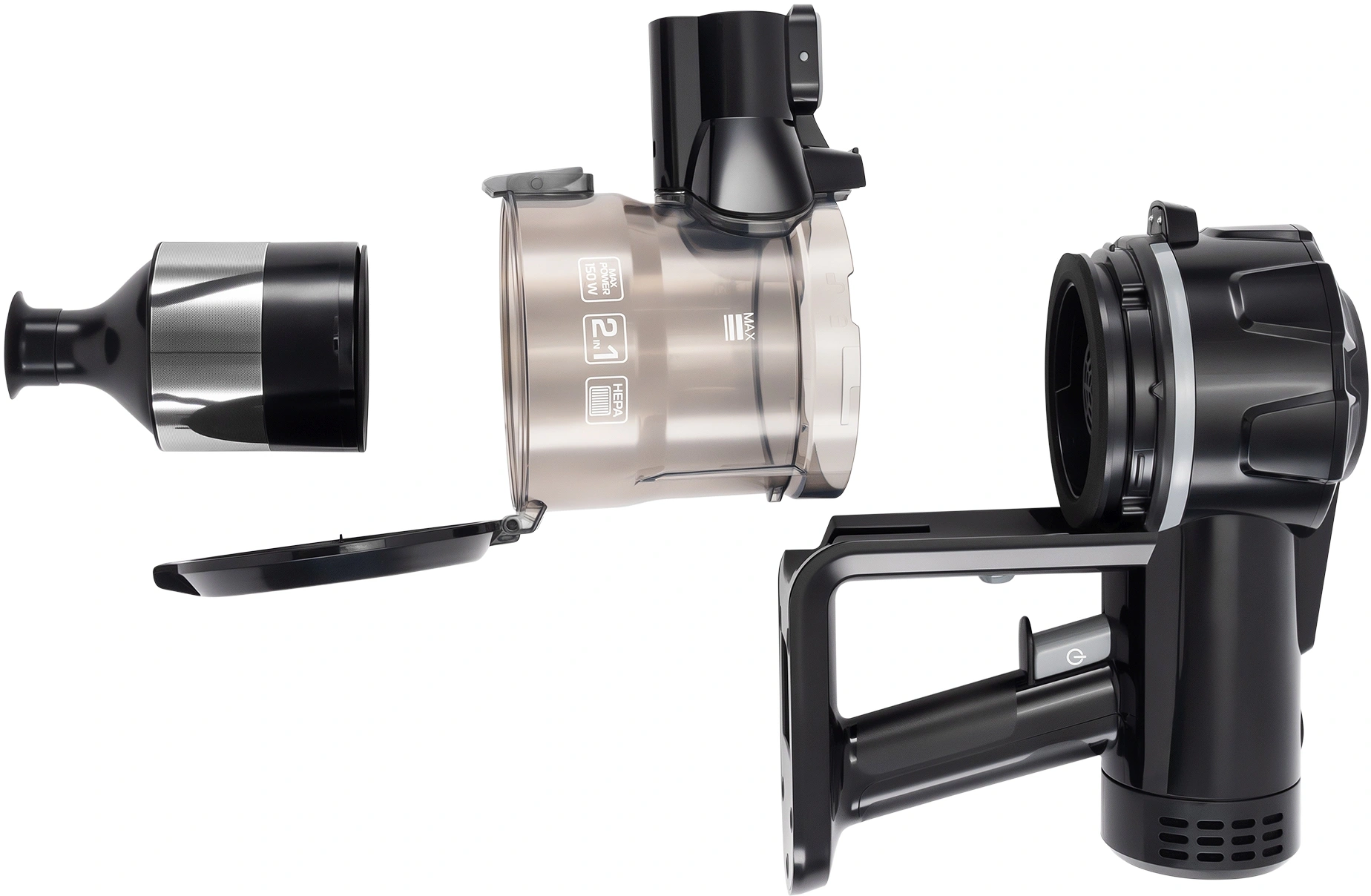 Объем контейнера для пыли составляет 0.6 литра — его достаточно для одной-двух полных уборок. При этом контейнер легко снимается и очищается, что делает эксплуатацию простой. Еще одно преимущество — наличие съемного ручного пылесоса, с которым удобно чистить мебель, лестницы и салон автомобиля.