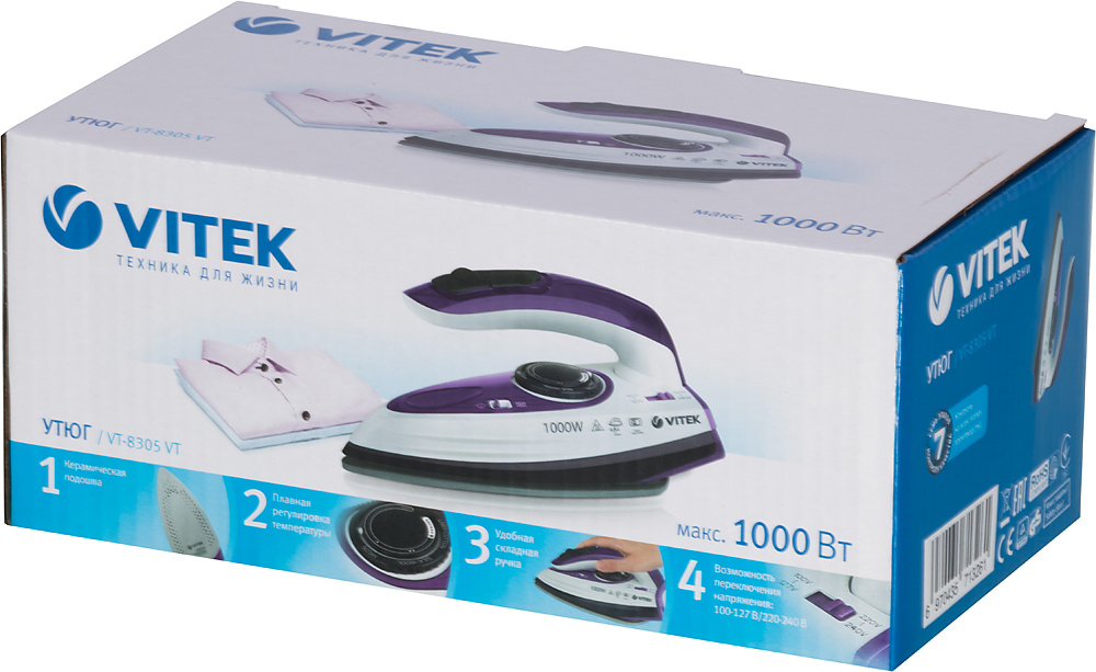Легкий и компактный утюг VITEK VT-8305 станет вашим надежным спутником в путешествиях и деловых поездках. Несмотря на скромные размеры, VITEK VT-8305 имеет мощность в 1000 Вт и набор необходимых функций, включая отпаривание. Керамическое покрытие подошвы обеспечивает стабильный нагрев.