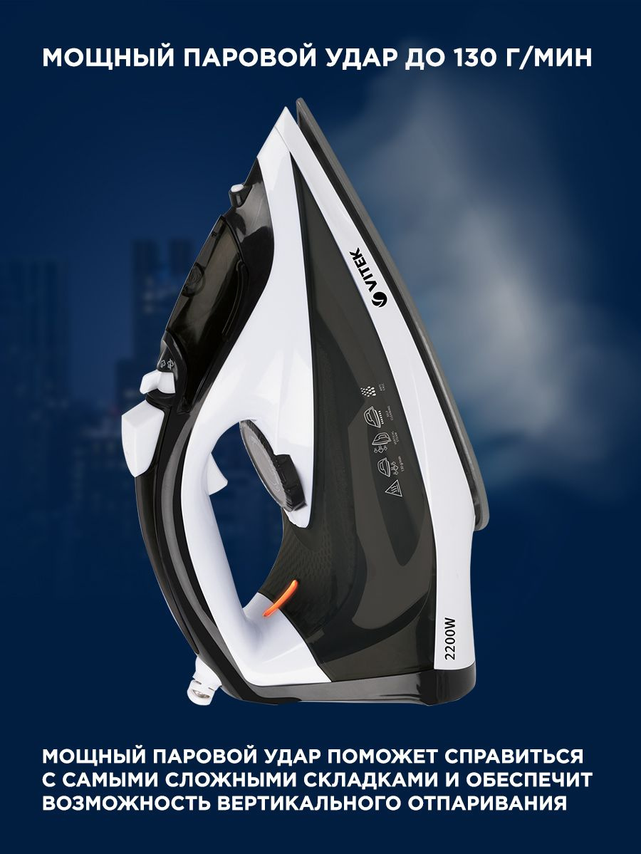 Описание Безупречно отгладить одежду не только из тонких, но и плотных тканей поможет утюг VITEK VT-1267 с максимальной мощностью 2200 Вт. Прибор оснащен различными режимами отпаривания, в том числе вертикального. Подошва утюга имеет устойчивое к царапинам двойное керамическое покрытие UniCera.