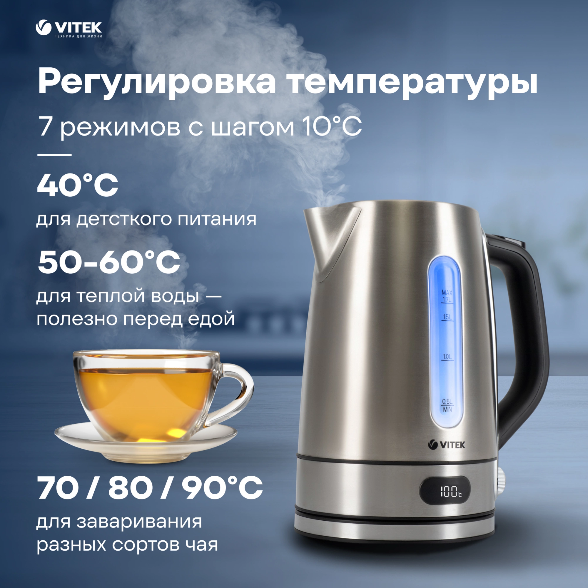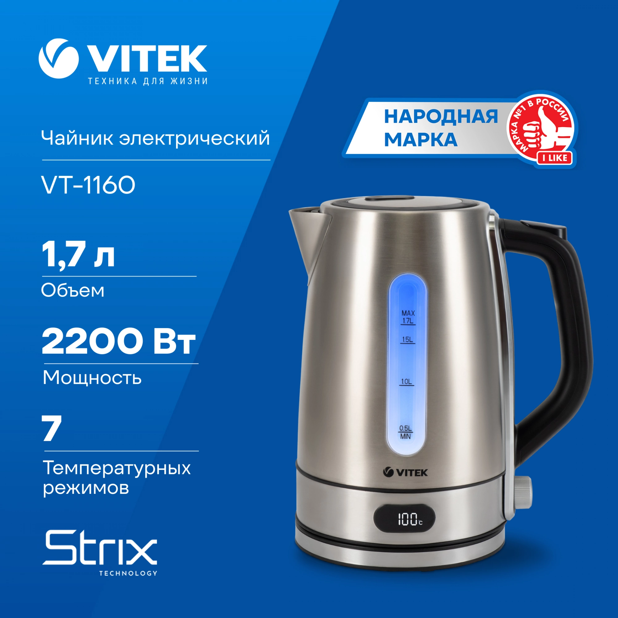 Для тех, кто любит качественную бытовую технику, идеально подойдет чайник VITEK VT-1160 с максимальной мощностью 2200 Вт и корпусом из нержавеющей стали. Его объем в 1,7 л позволяет готовить большое количество порций горячих напитков одновременно. Сертифицированный английский контроллер STRIX гарантирует устройству долгий срок службы.