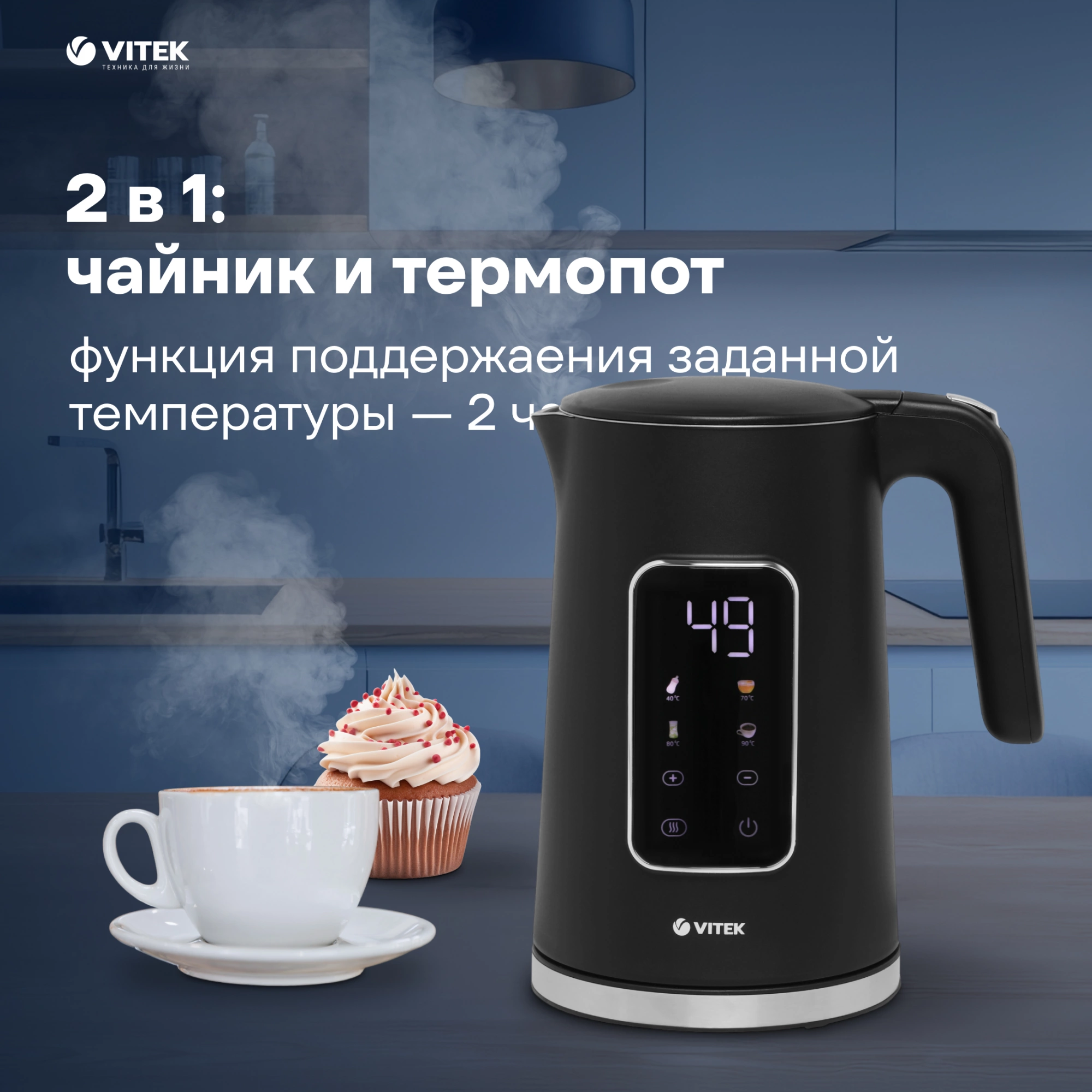 Стильный чайник VITEK VT-1162 с корпусом из термостойкого пластика и нержавеющей стали станет одним из самых желанных аксессуаров на вашей кухне. Отличительной особенностью модели являются двойные стенки корпуса и большой сенсорный дисплей с индикацией температурных режимов. Смотрится очень стильно и современно! Благодаря многофункциональности чайника Вы сможете каждый день угощать своих близких идеально приготовленными горячими напитками. С мощностью (2200 Вт) электрочайник VT-1162 в считанные минуты вскипятит воду (1,7 л) или нагреет ее до нужной температуры. В чайнике предусмотрено 4 режима для подогрева воды — 40°С, 70°С, 80°С, 90°С, а также функция поддержания температуры (до 2 часов). Тринадцать режимов регулировки температуры нагрева воды от 40°С до 100°С позволят заваривать кофе, зеленый, белый чай или приготовить детское питание водой правильной температуры. Благодаря технологии Cool touch он абсолютно безопасен в работе: поверхность не нагревается в процессе кипячения воды! Чайник соединён с базой центральным контактом и легко вращается на 360?C градусов, обеспечивая полную свободу передвижения. Нагревательный элемент чайника VT- 1162 встроен в плоское дно и надежно защищен стальной пластиной, это позволяет не только сделать чайник привлекательным даже изнутри, но и делает его чистку максимально удобной. В чайнике VT- 1162 три степени безопасности: защита от перегрева, автоматическое выключение при закипании и отсутствии воды. Купите чайник VITEK VT-1162 и наслаждайтесь любимыми напитками!