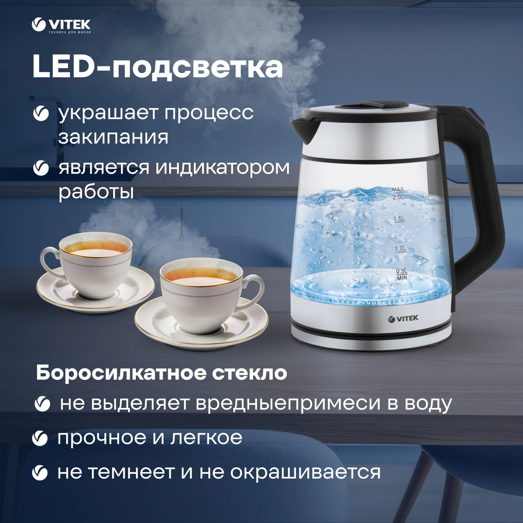 Позвольте чайнику VITEK VT-1176 с максимальной мощностью 2200 Вт и яркой внутренней подсветкой украсить ваш быт! Его объем составляет 2 л, благодаря чему вы можете не беспокоится, что кому-то из ваших друзей не хватит чая или кофе.