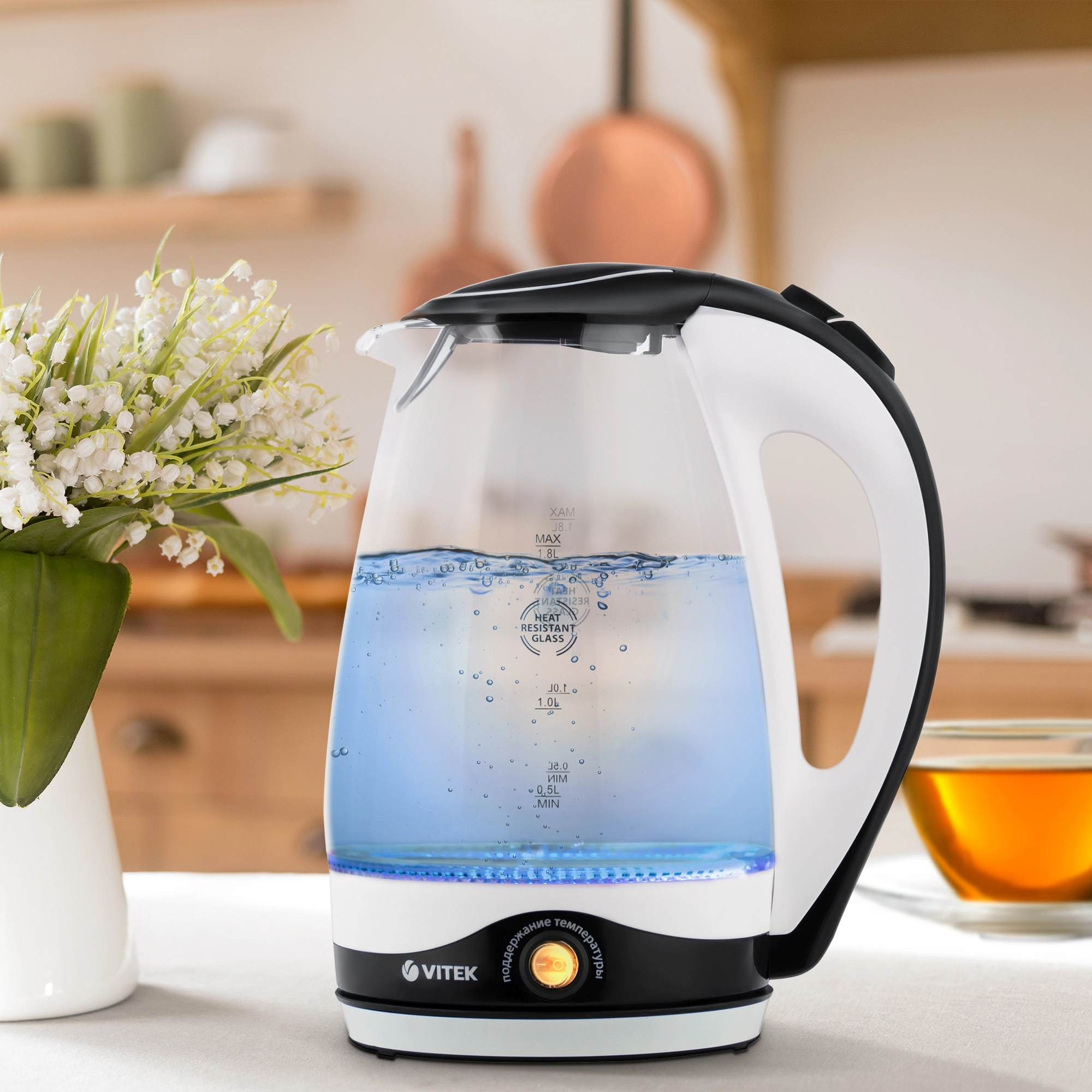 кнопка открытия крышки, подсветка воды, подставка 360, фильтр от накипи