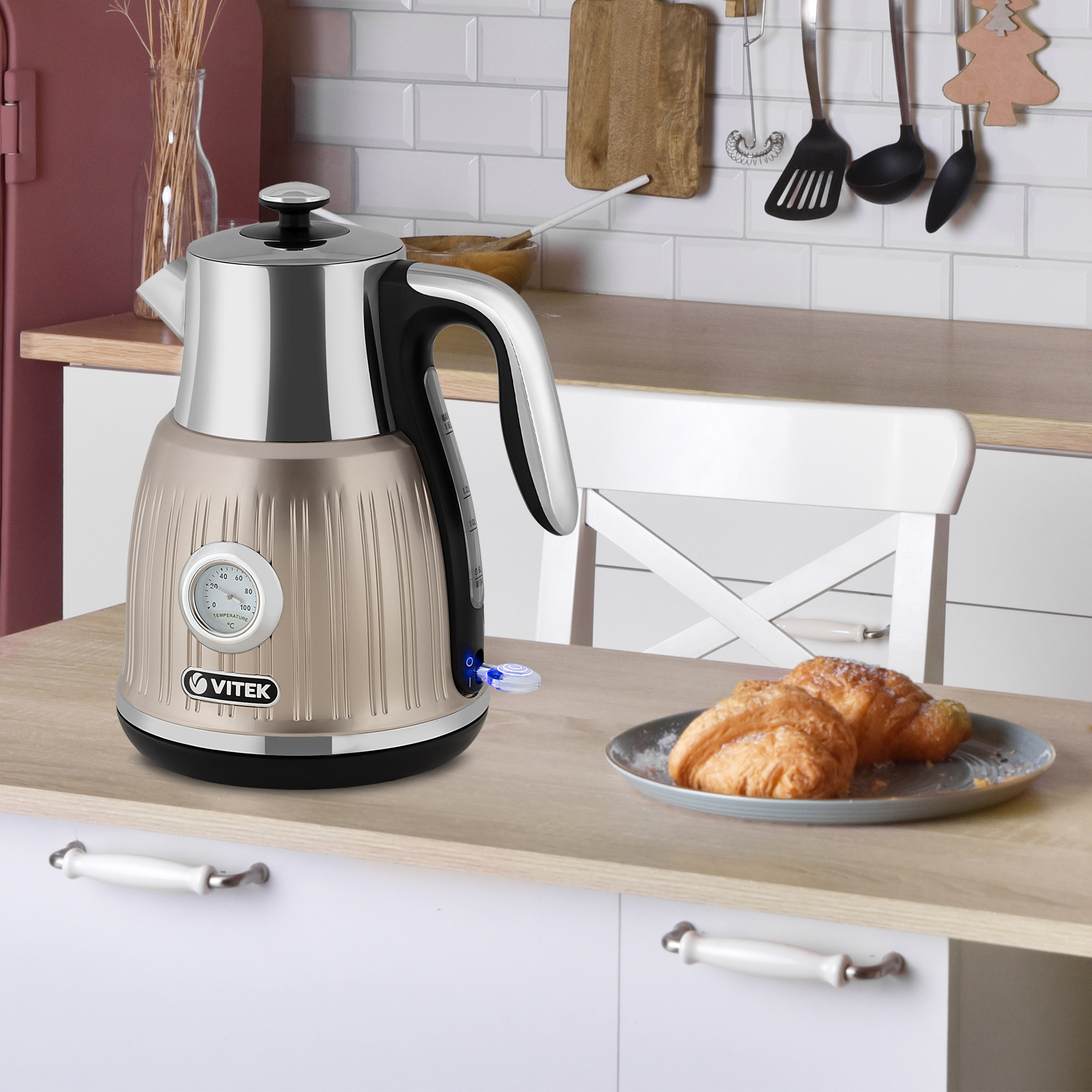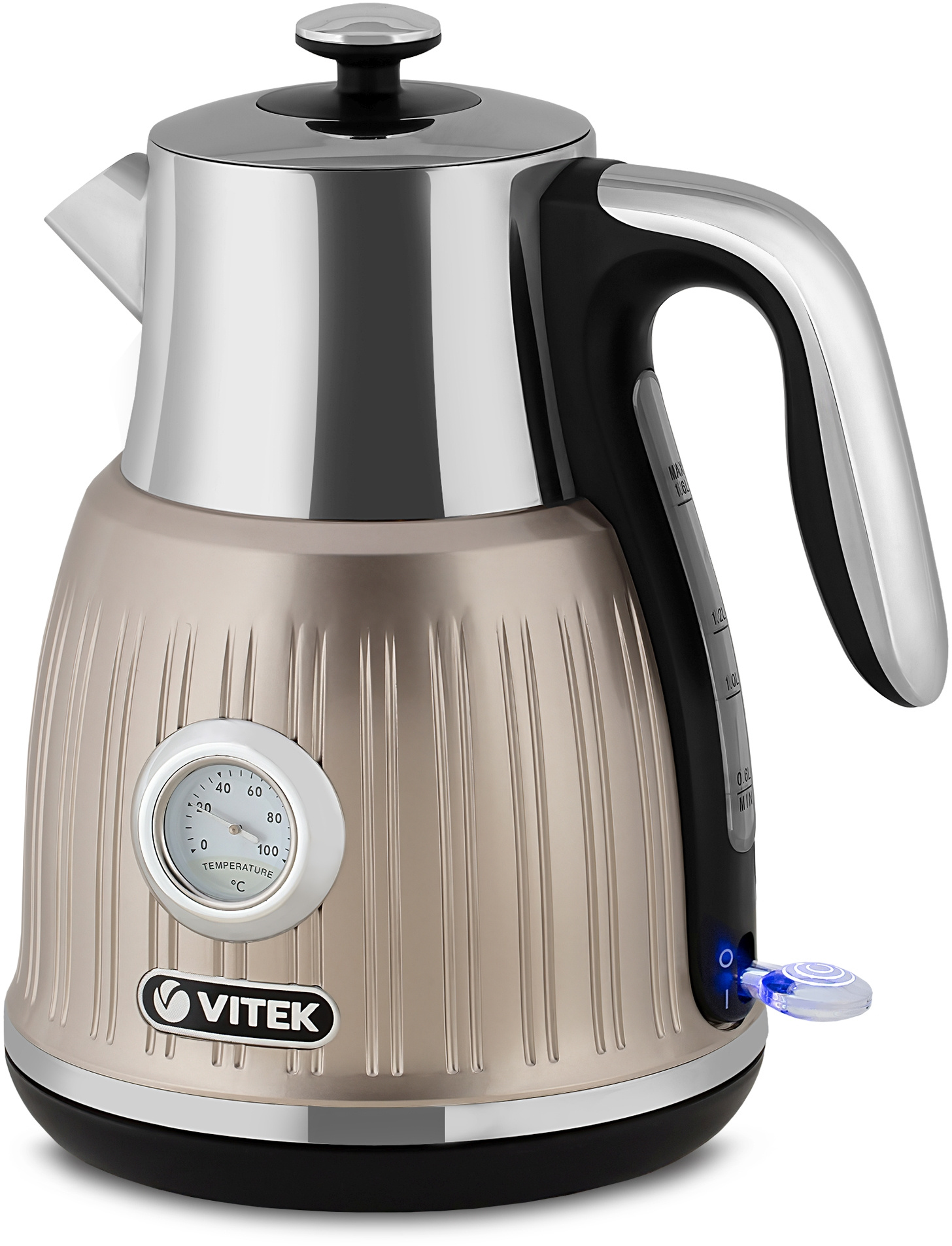 Современный чайник VT-7067 в стиле ретро станет успешным дополнением классических кухонь и даже ультрасовременных в стилях хай-тек и лофт. В чайнике VT- 7067 используется сертифицированный английский контроллер Strix controller. Благодаря такой системе чайник выдерживает 15 000 циклов кипячения! Также безопасность устройству обеспечивает функция автоотключения при закипании воды и функция защиты от перегрева. Крышка, как и у многих моделей в ретро-дизайне полностью съёмная, а на лицевой части корпуса расположен винтажный термометр: можно просто следить за повышением температуры и выключить чайник, когда это нужно.
