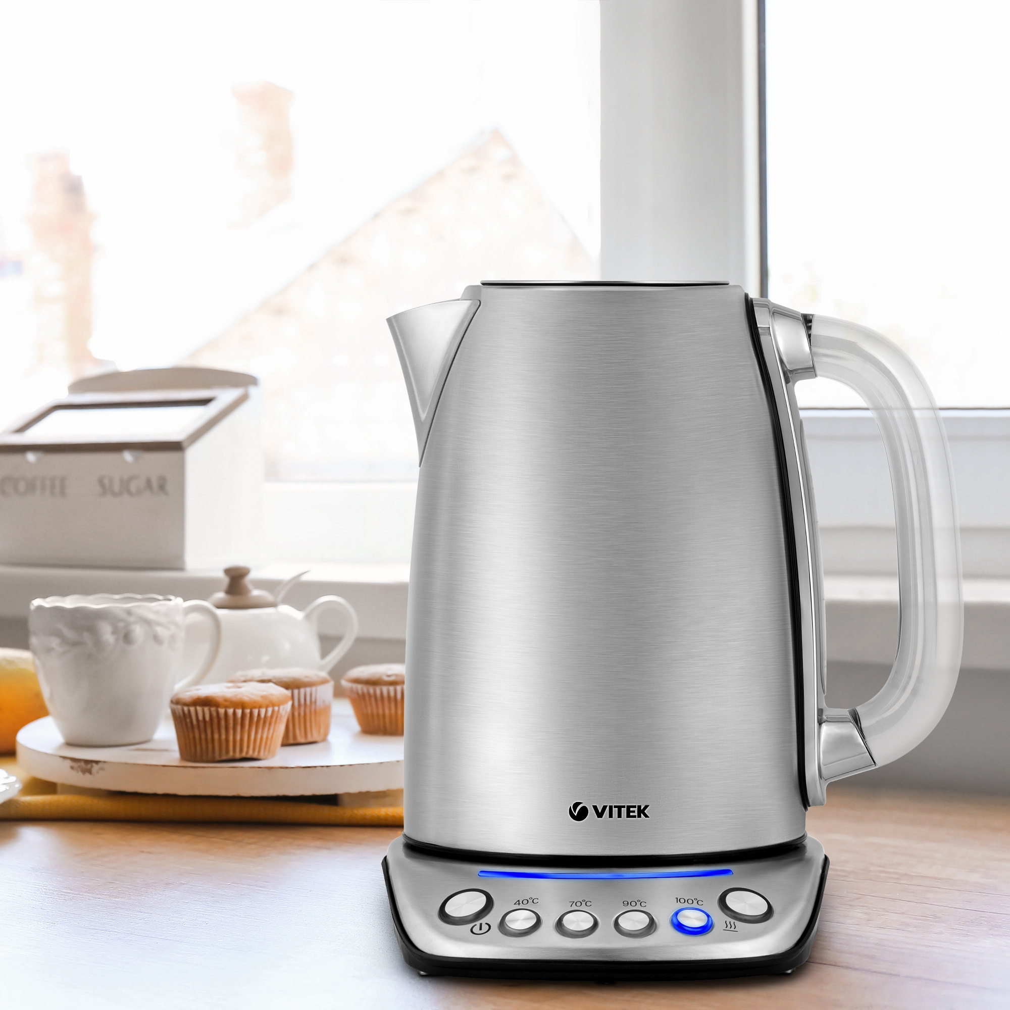 Технологичный чайник VITEK VT-7089 в корпусе из нержавеющей стали с автоматической крышкой способен не только кипятить воду, но и нагревать ее до нужной вам температуры: 40 градусов, оптимальная температура для приготовления детского питания, а также 70 и 90 градусов, для приготовления различных сортов чая. Благодаря кнопке Keep warm выбранная температура может поддерживаться в течение 30 минут. Современная панель управления температурными режимами имеет интуитивно понятный интерфейс. Удобная шкала индикатора уровня воды позволяет легко определить ее количество в чайнике, а английский контроллер Strix гарантирует безопасность и более 10 тысяч циклов кипячения.