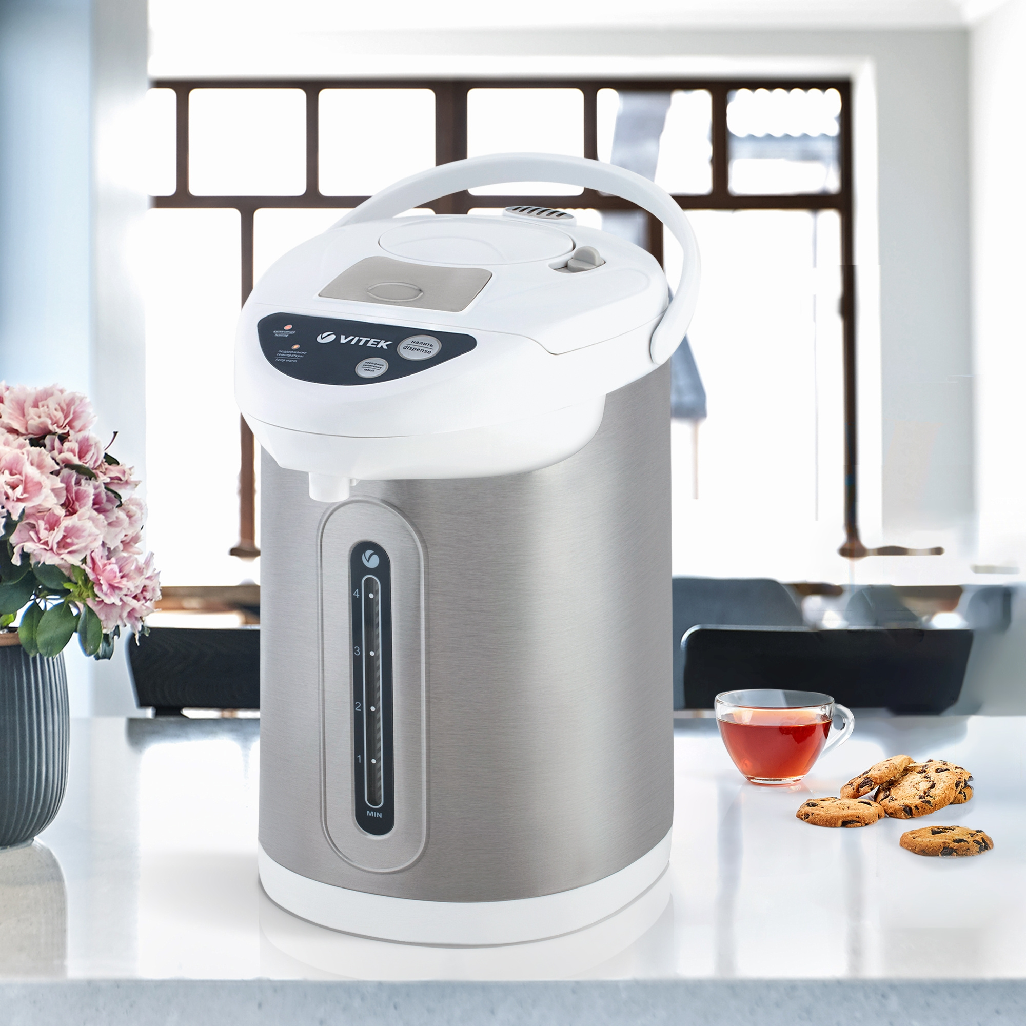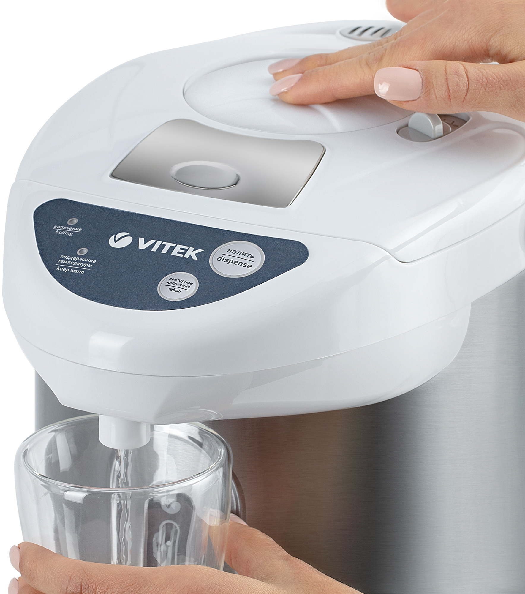 С четырехлитровым термопотом VITEK VT-1196 ваши близкие, коллеги или гости без хлопот насладятся чаем или кофе. Стильный прибор безопасен и прост в эксплуатации, снабжен индикатором уровня воды. Подача воды осуществляется вручную, автоматически или при нажатии чашкой на клапан.