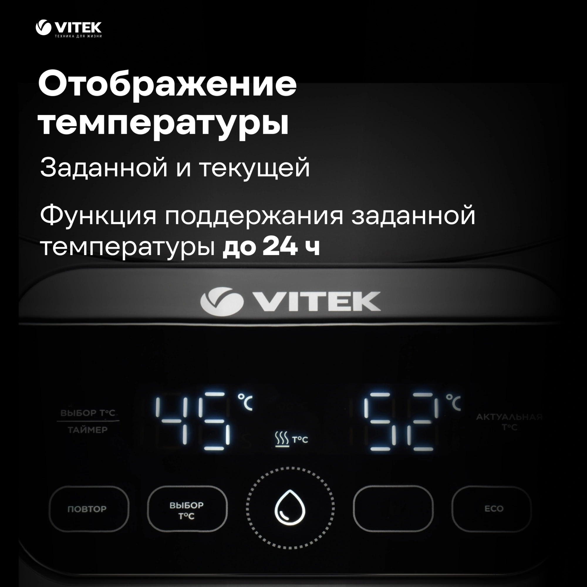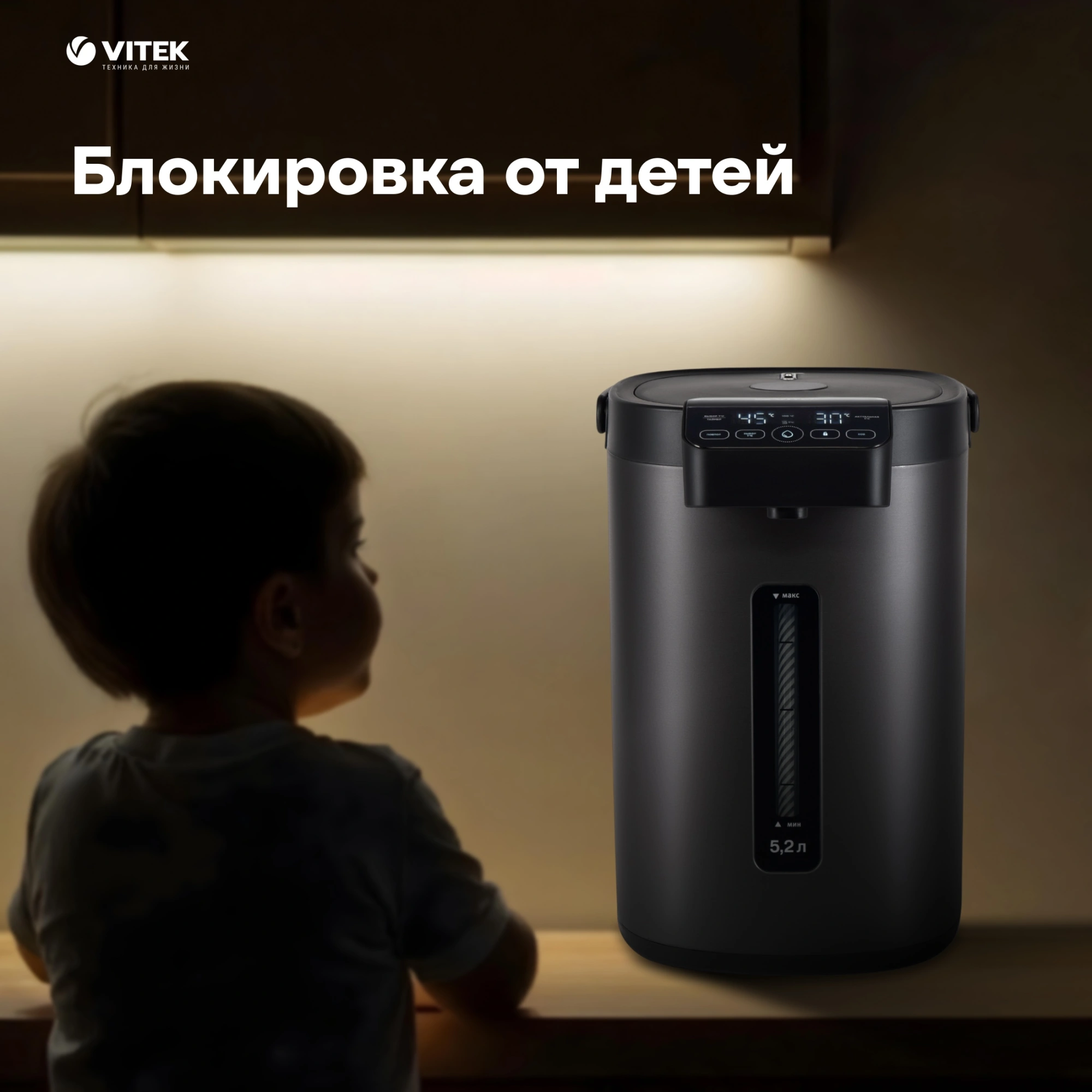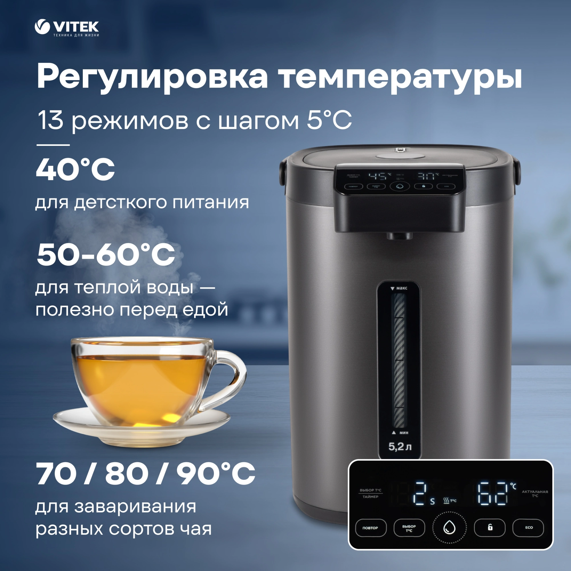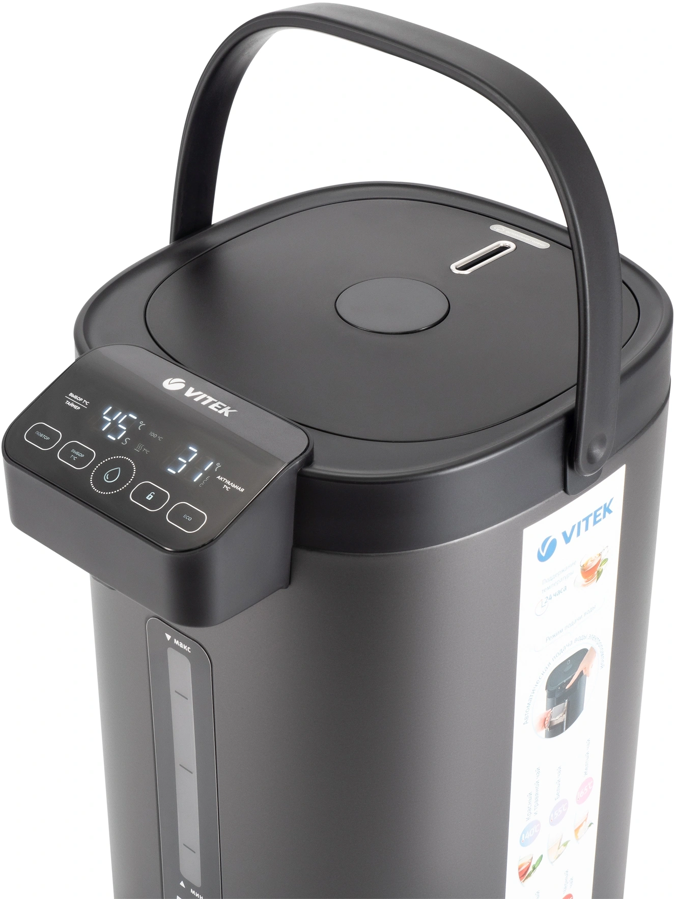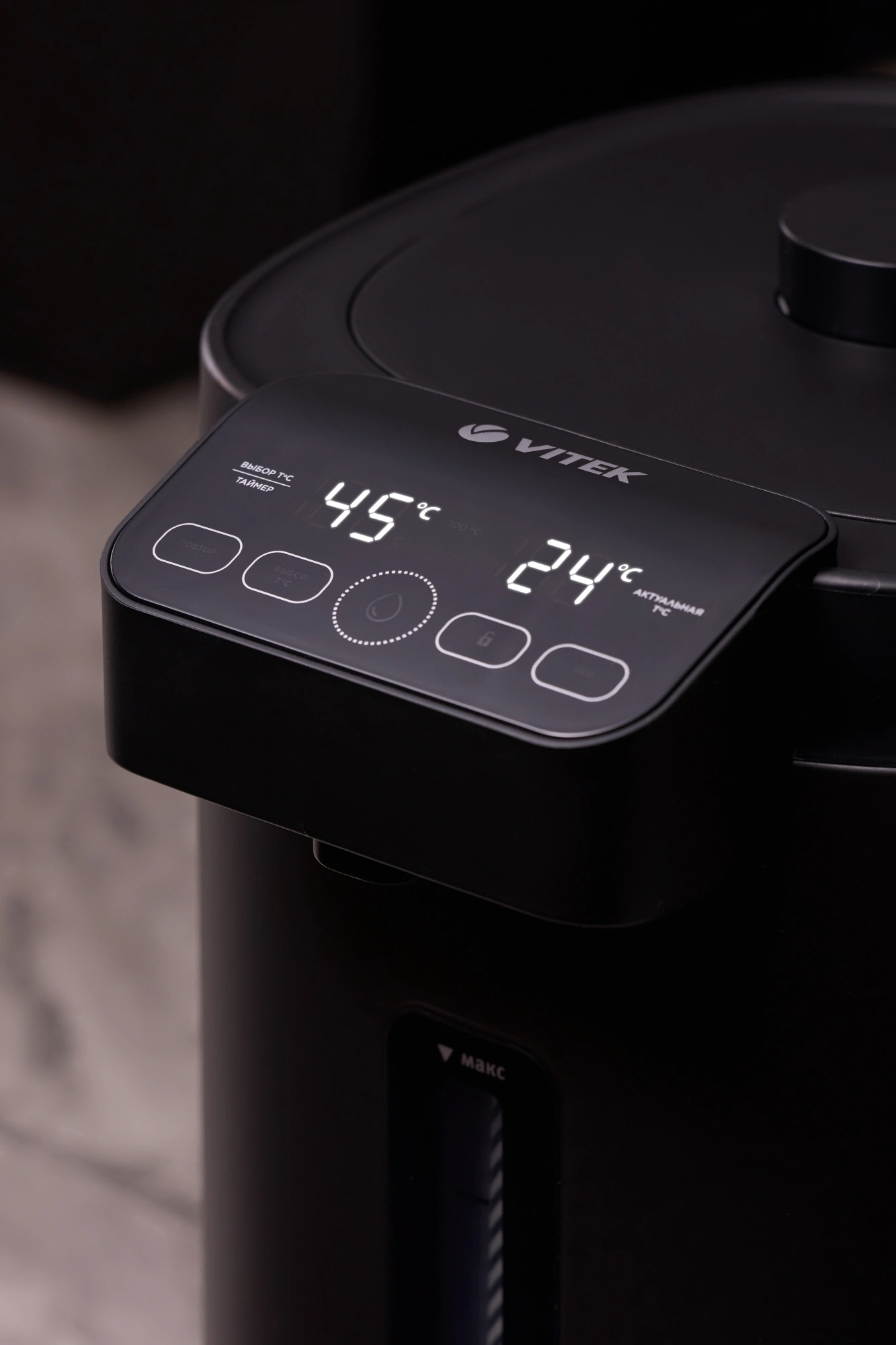 Функция поддержания температуры особенно удобна в быту, ведь благодаря ей у вас под рукой всегда будет вода нужной температуры. Широкий диапазон температур (40/45/50/55/60/65/70/75/80/85/90/95°C) позволит довести любой напиток до совершенства. Благодаря термопоту VITEK VT-1191, вы можете с легкостью готовить детское питание или чай для долгих посиделок с друзьями! А если нужно заварить новую порцию — просто используйте функцию повторного кипячения.