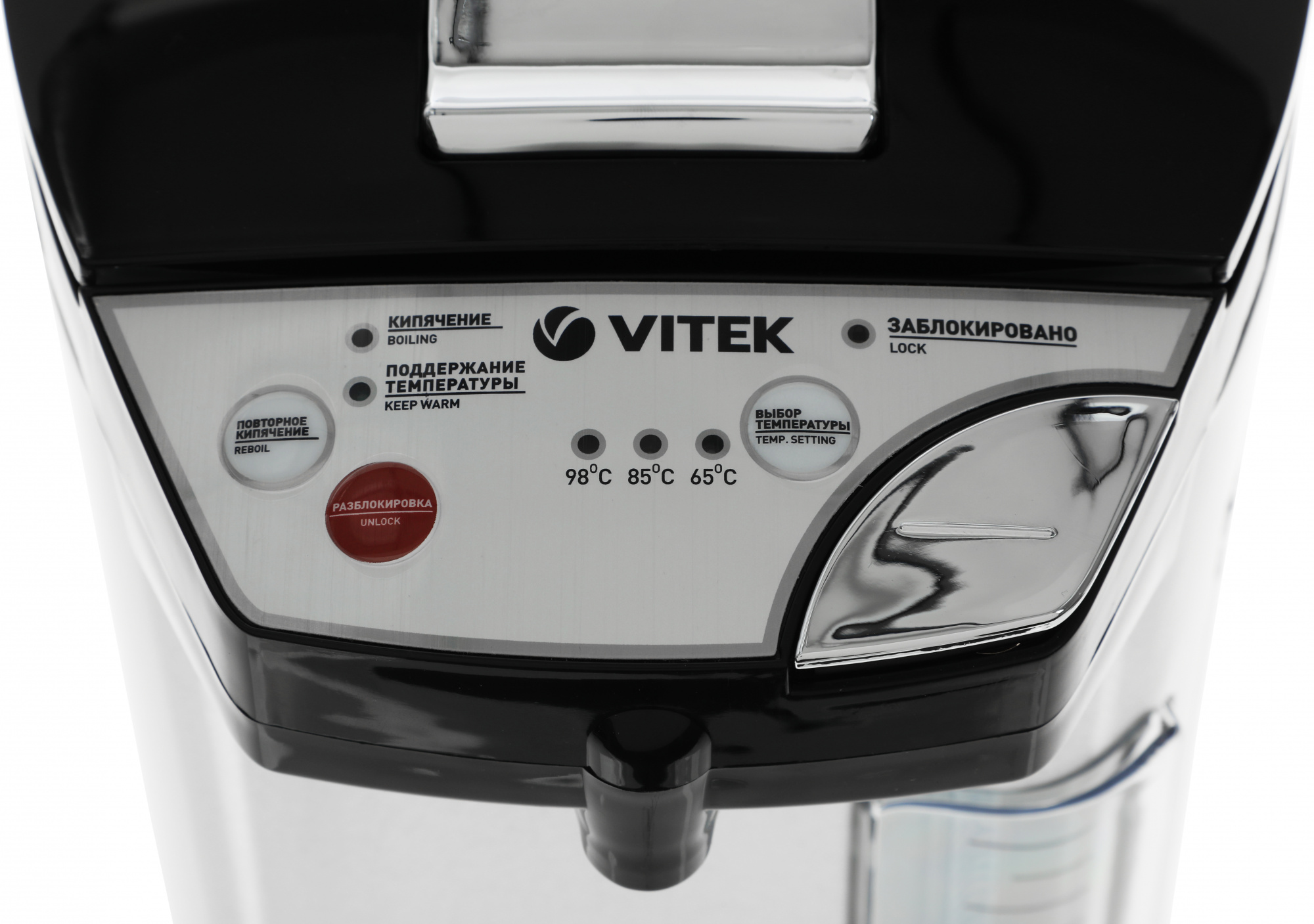 Термопот VITEK VT-7115 позволит вам не только быстро нагреть воду объемом 5 л до температуры 65°С/85°С/98°С, но и сохранить ее в горячем виде, благодаря функции поддержания температуры. В приборе предусмотрено три способа подачи воды: чтобы налить ее в емкость, можно воспользоваться специальным насосом (механической помпой), электрической помпой или просто нажать чашкой на клапан. Хотите еще раз нагреть воду? Нет ничего проще, в термопоте имеется функция повторного кипячения. Следить за уровнем воды позволяет удобная широкая шкала, расположенная на корпусе прибора. Корпус его изготовлен из высококачественной нержавеющей стали, что гарантирует устройству длительный срок эксплуатации. Для максимально безопасного использования в устройстве предусмотрена функция блокировки, поэтому можно быть уверенным, что вода не польется случайно. Максимальная мощность прибора — 800 Вт. Купите термопот VITEK VT-7115, который идеально справляется со своими обязанностями!