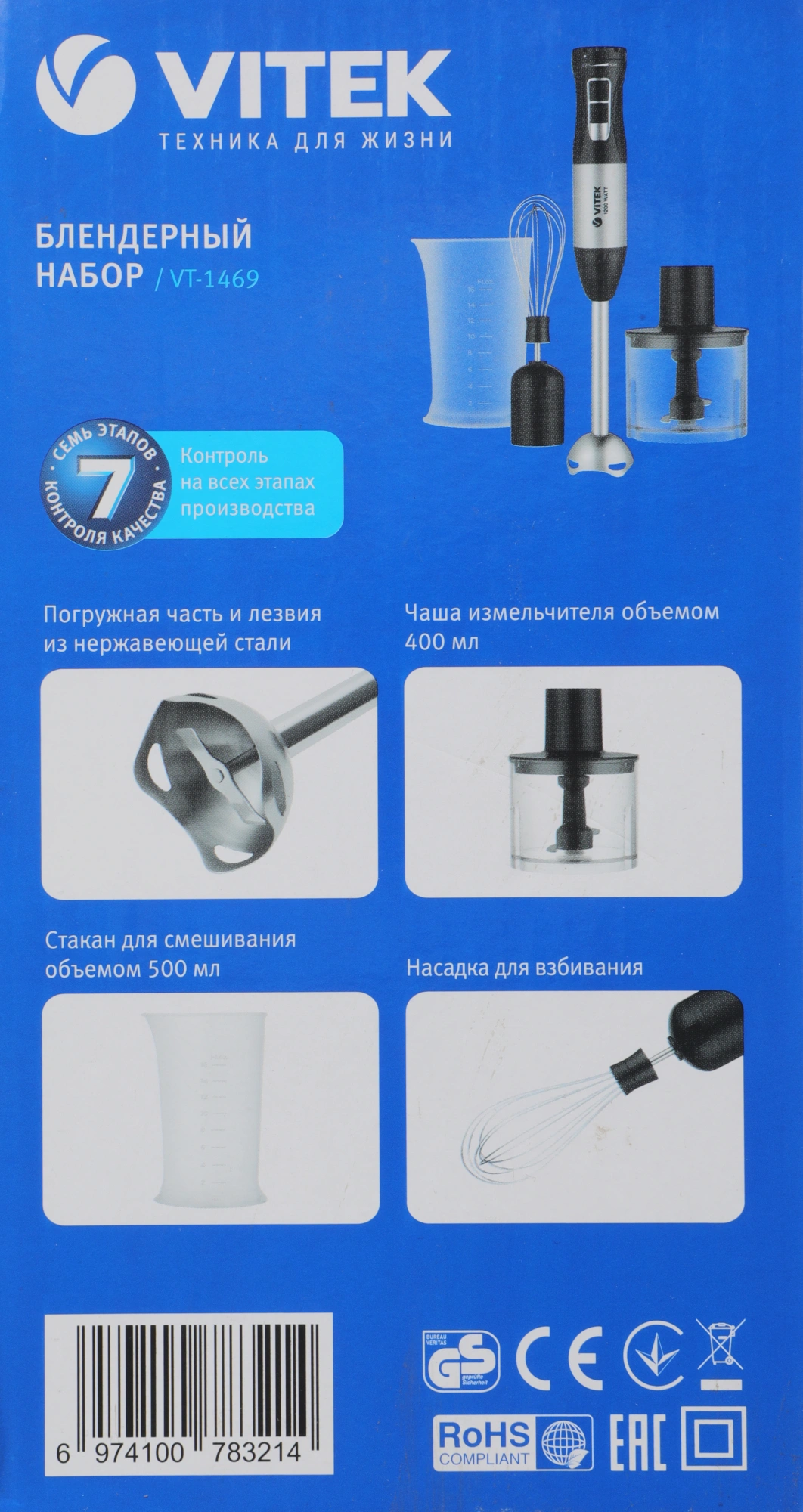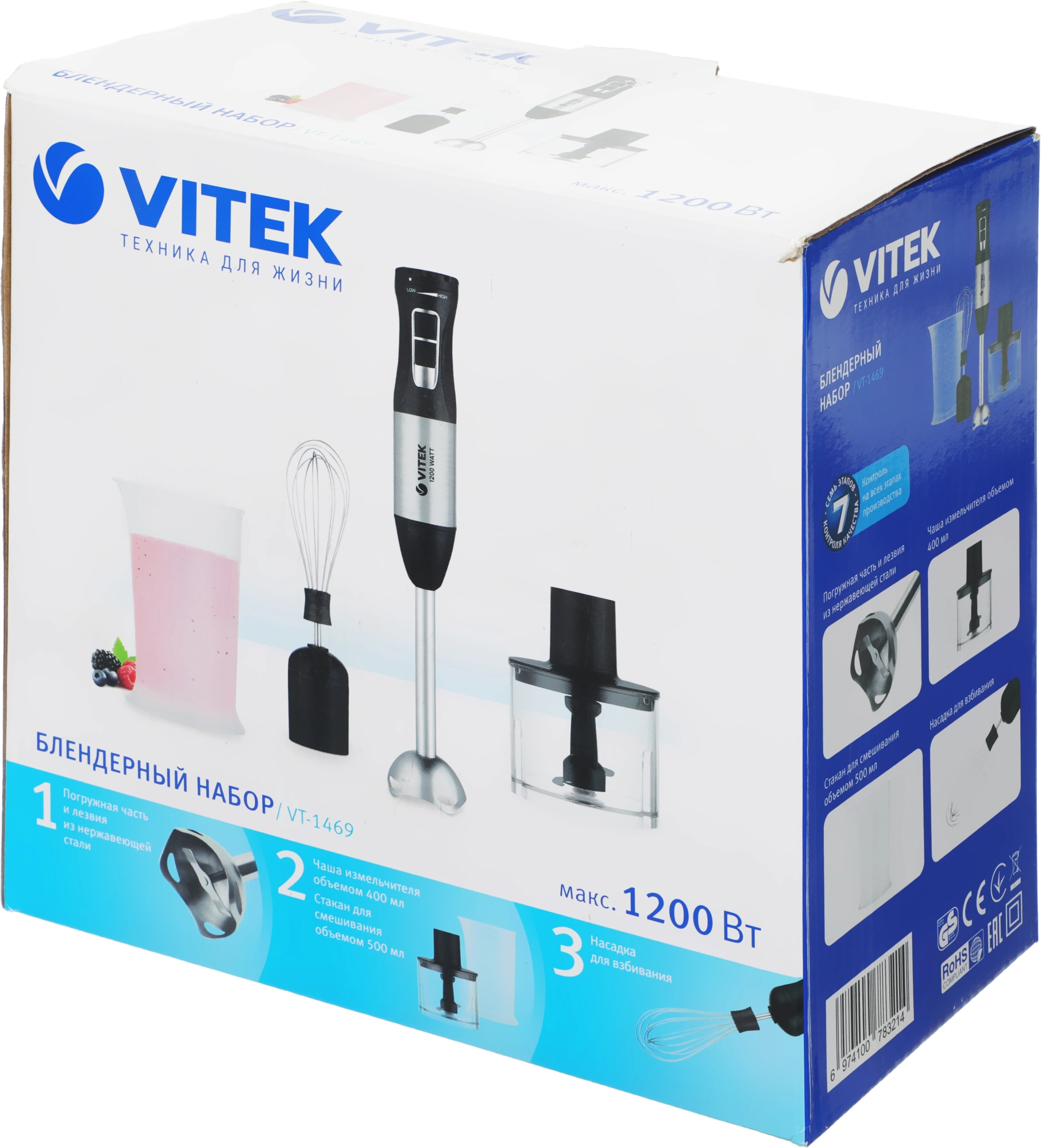 Погружной блендер VITEK VT-1469 поможет быстро приготовить ваши любимые блюда: пюре, муссы, молочные коктейли. Идеально соблюсти все пропорции рецептуры, взбить и смешать жидкие ингредиенты, готовить вкусные коктейли Вы можете, благодаря пластиковой чаше 400 мл. набора и мерному стакану объемом 500 мл входящему в комплект. Для особенно быстрого и мощного измельчения продуктов в нем также предусмотрен режим TURBO. Эта модель оборудована мотором мощностью 1200 Вт. Благодаря ему взбивание, измельчение, пюрирование происходит за считаные секунды. Купите блендер VT-1469 и обеспечьте себе комфорт на кухне!