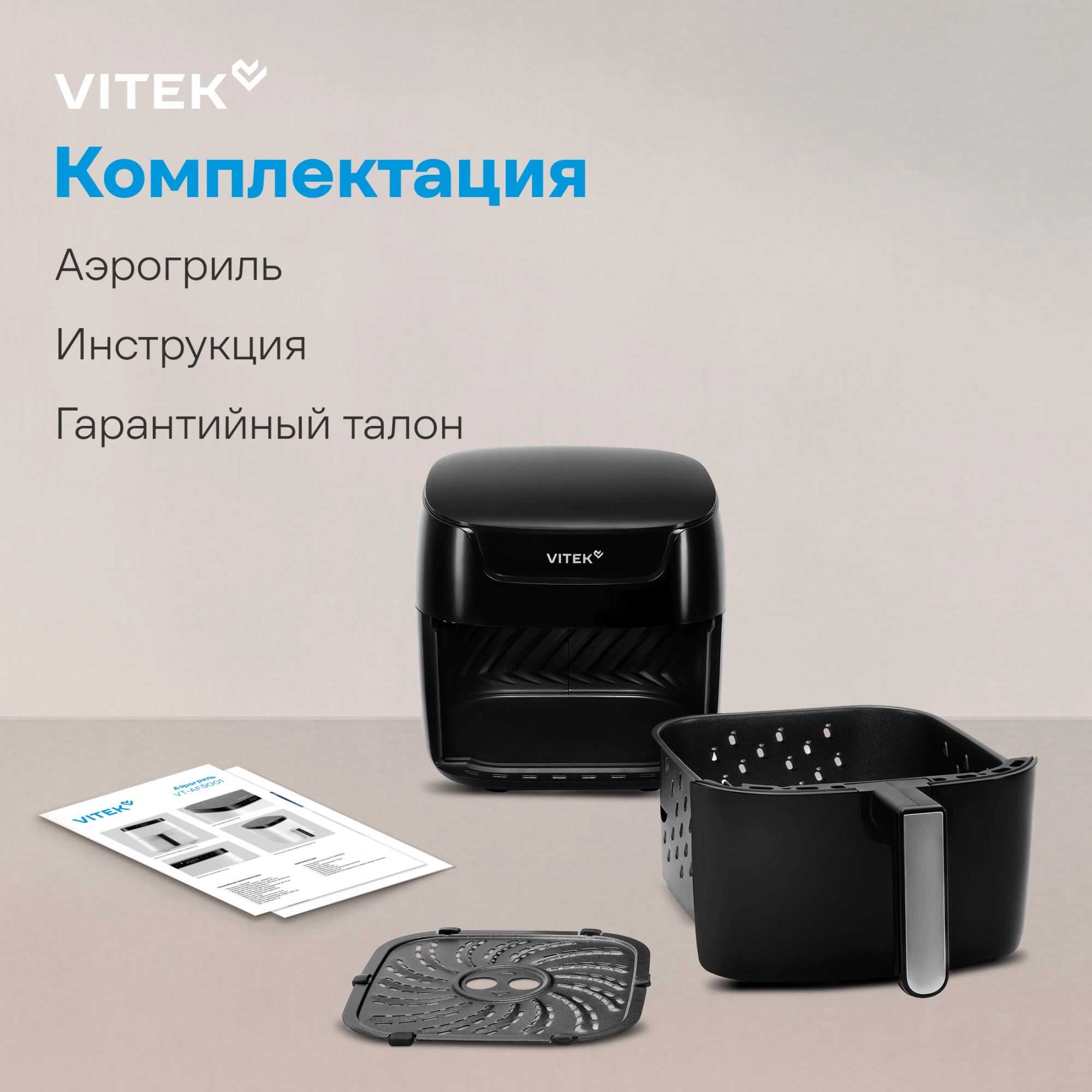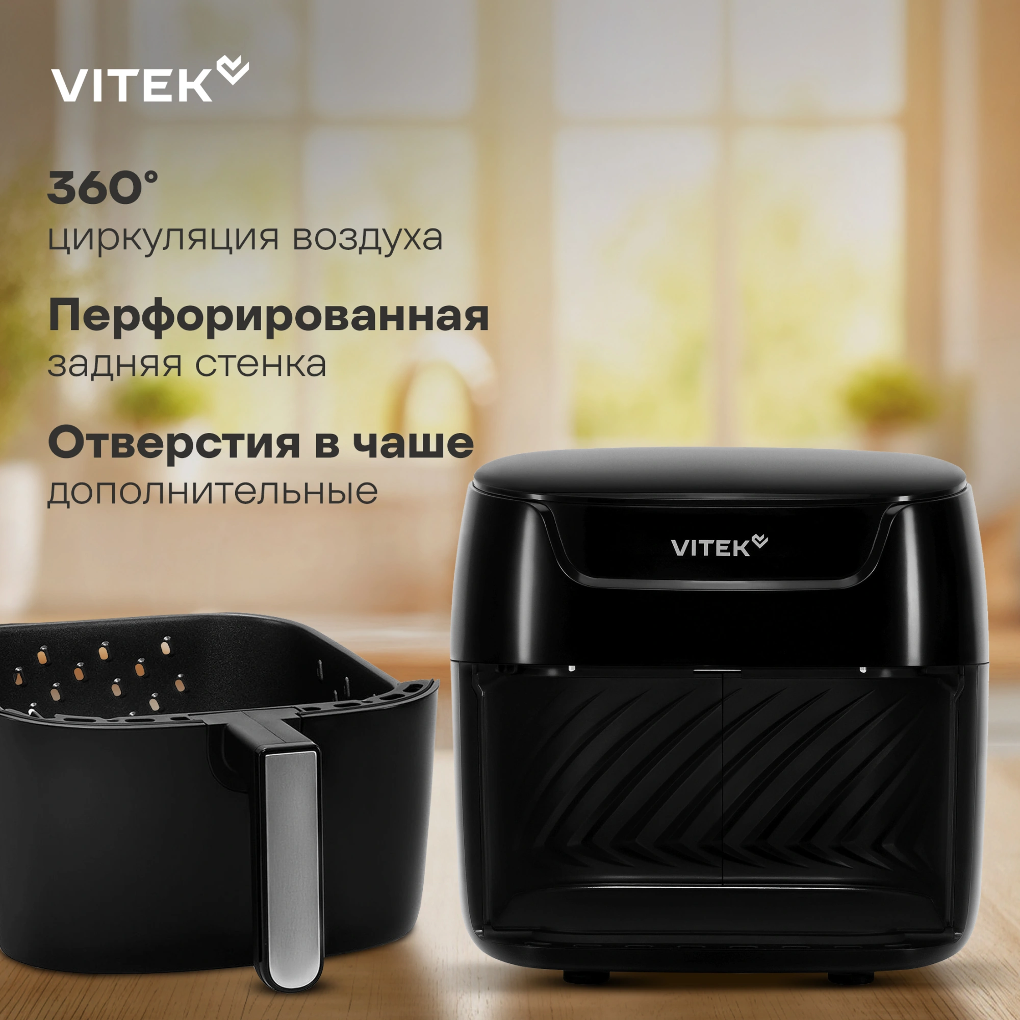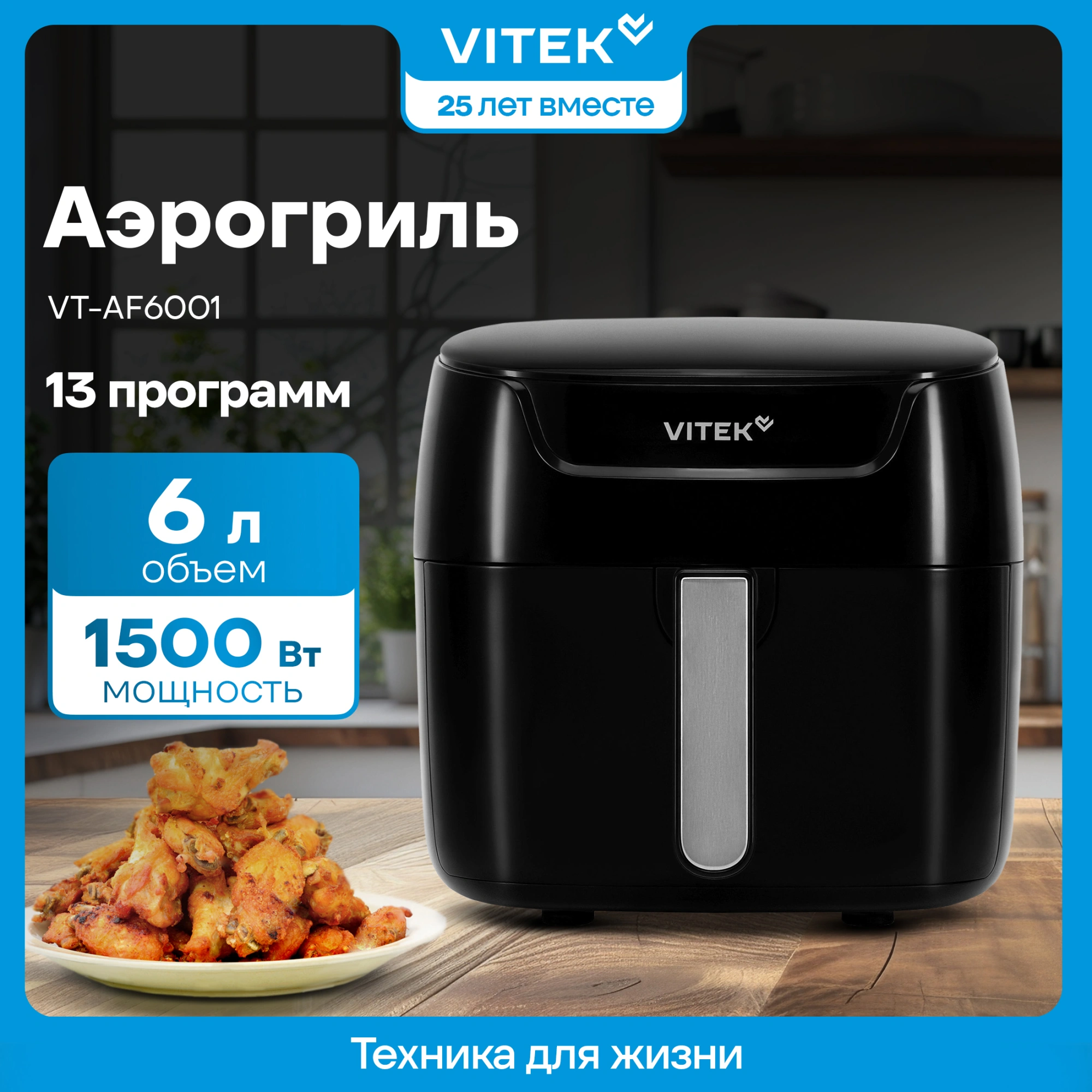 Аэрогриль Vitek VT-AF6001 — стильный чёрный аэрогриль электрический 6 литров, создающий ярко-золотистую корочку без лишнего масла благодаря направленному потоку горячего воздуха.