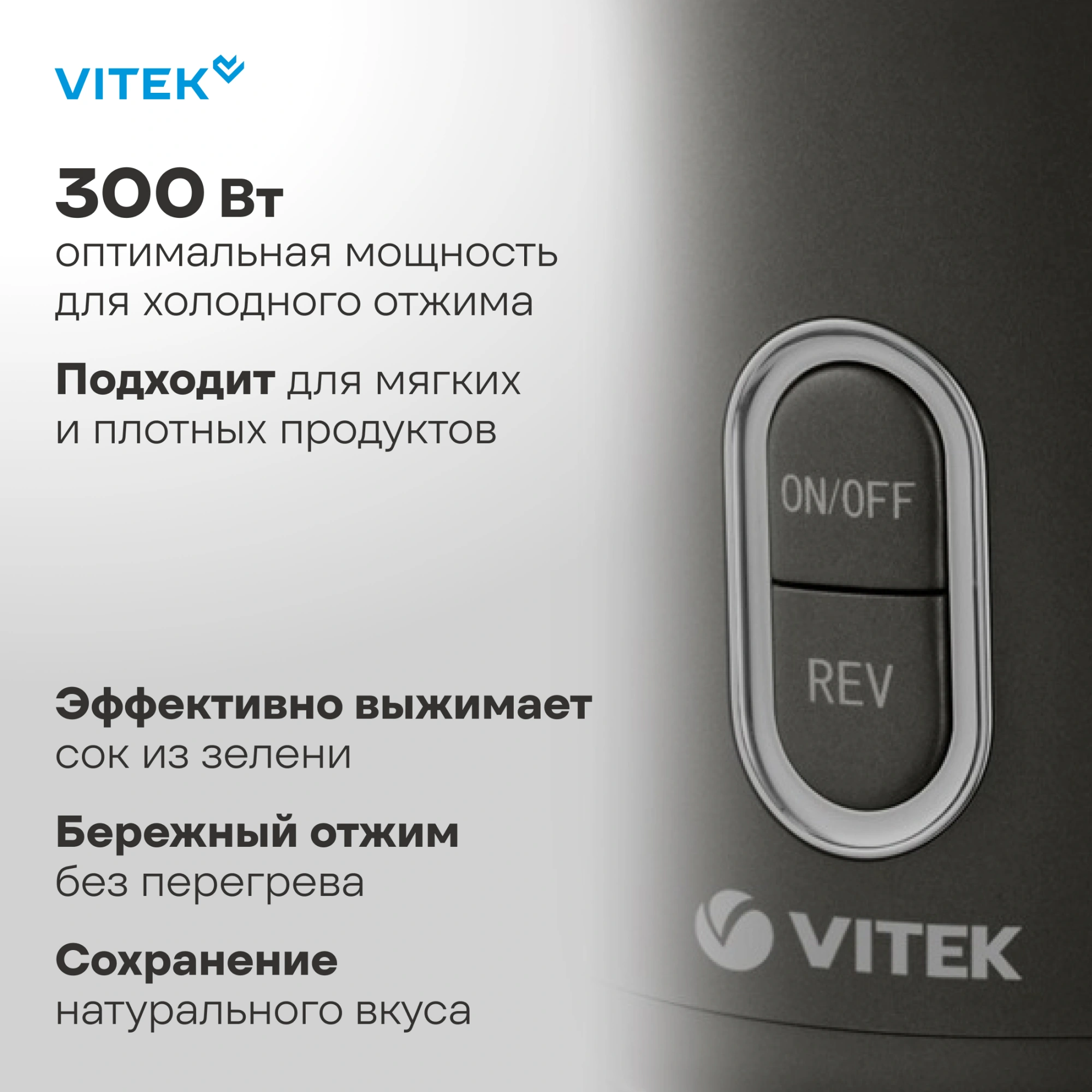 Шнековая соковыжималка VITEK VT-3715 – уникальная находка для тех, кто любит натуральные соки и заботится о своем здоровье! Благодаря технологии холодного прессового отжима в соке сохраняются все витамины и микроэлементы. Главный принцип работы соковыжималки – это медленное (80-100 об/мин.) вращение шнека, продавливающего продукт и исключающего его нагрев. Ширина горловины (48 мм) не предусматривает загрузку целых плодов. Проталкивать кусочки овощей и фруктов можно с помощью пластикового толкателя, который идет в комплекте. В модели VT-3715 установлен эффективный, с низким уровнем шума DC-мотор. Носик для сока оборудован крышкой, с помощью которой можно прекратить подачу сока, когда нужно освободить емкость. Это защищает от проливания капель жидкости на поверхность. В соковыжималке предусмотрено два контейнера: для сока 0,28 л. и мякоти 0,36 л. Прибор также оснащен специальной системой защиты от перегрева электромотора: соковыжималка автоматически отключится в случае его перегрева. Шнековая соковыжималка VT-3715 – это идеальное решение для тех, кто ценит удобство, экономию места на кухне и полезные соки для всей семьи.