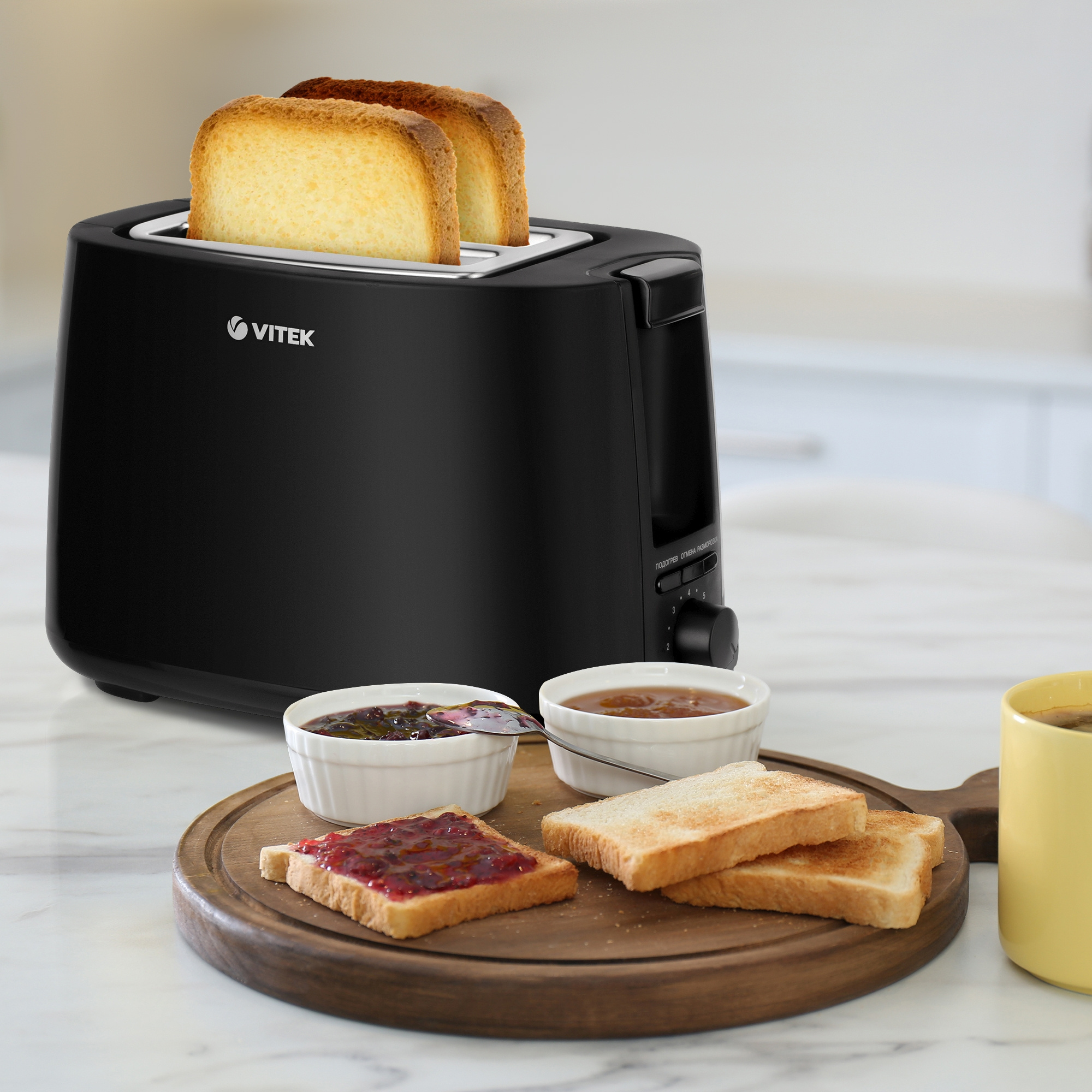 Тостер VITEK VT-7157 - доступная и современная модель, которая имеет те же функции, что и более дорогие устройства. Корпус прибора сделан из черного глянцевого пластика. Плавные линии позволяют ему хорошо смотреться в любой кухне. Кнопки выбора режима и регулятор температуры находятся на торцевой части тостера (классическое решение). Функция подогрева поможет сделать аппетитными даже остывшие тосты, а возможность автоматической разморозки понравится тем, кто покупает замороженную выпечку. Дополнительно тостер имеет возможность прекращения работы при нажатии кнопки "отмена" и поддон для сбора крошек.