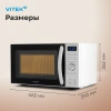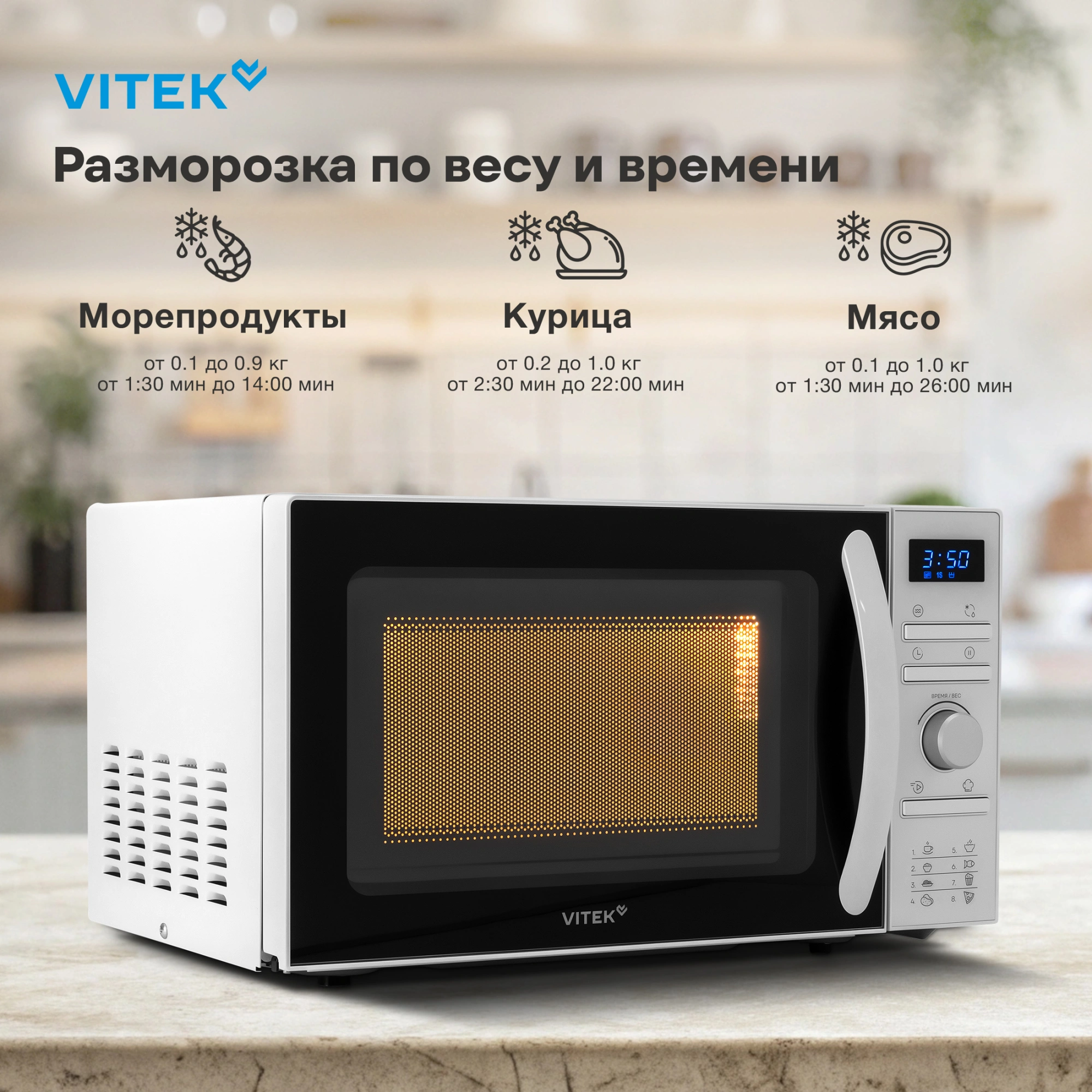 Vitek VT-MW0320 — компактная отдельностоящая микроволновая печь для ежедневной кухни. Камера 20 л рассчитана на тарелки стандартного диаметра и высокие чашки, стеклянный поворотный стол 245 мм равномерно распределяет микроволны в центре и по краям. Выходная мощность 700 Вт обеспечивает динамичный разогрев без сложных настроек, внутренняя подсветка и полноразмерная стеклянная дверца дают хороший обзор процесса. Белый корпус визуально облегчает фасад, а аккуратная панель с LED дисплеем и часами выглядит современно и читабельно.