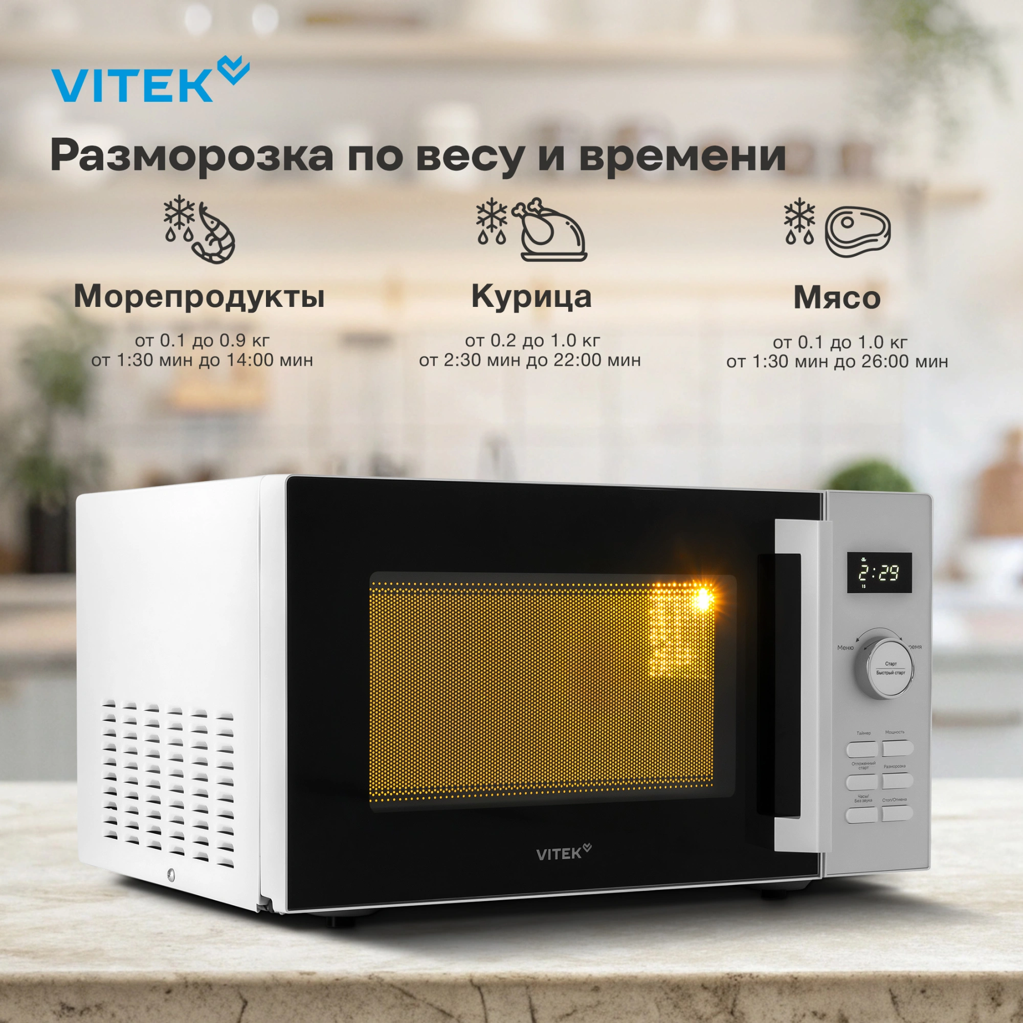 Ищете микроволновую печь, которая сочетает просторную камеру, понятное управление и аккуратный внешний вид для светлой кухни? Vitek VT-MW1525 в белом цвете создана как раз для ежедневных задач. Объем 25 л дает свободу в выборе посуды, удобно ставить большие тарелки и высокие формы. Стеклянный поворотный стол диаметром 270 мм распределяет микроволны равномерно по центру и краям, внутренняя подсветка и полноразмерная дверца из закаленного стекла обеспечивают хороший обзор процесса. Белый корпус визуально облегчает фасад, а хромированные детали поддерживают чистую геометрию и гармонируют с современной техникой.