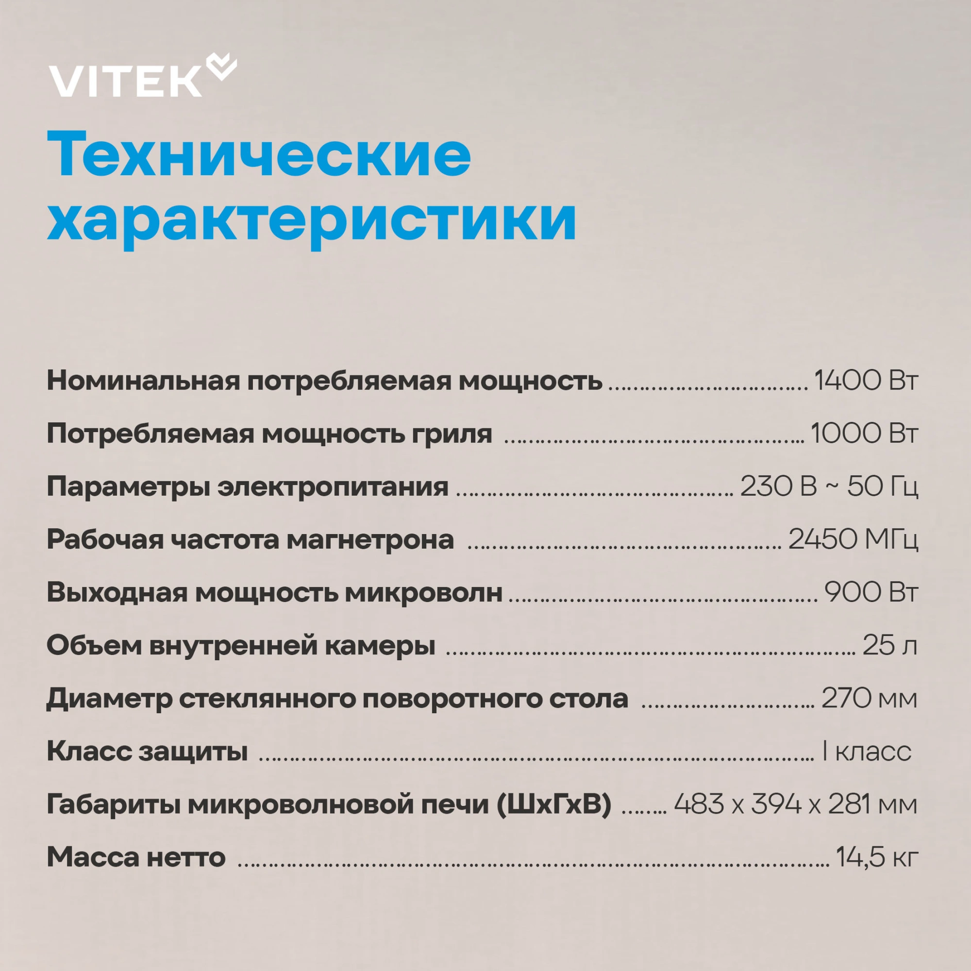 Vitek VT-MW1323 сочетает вместительную камеру, точные режимы и продуманный дизайн, оставаясь надежным помощником в повседневной готовке. Гарантия 24 месяца подтверждает качество и долговечность устройства.