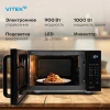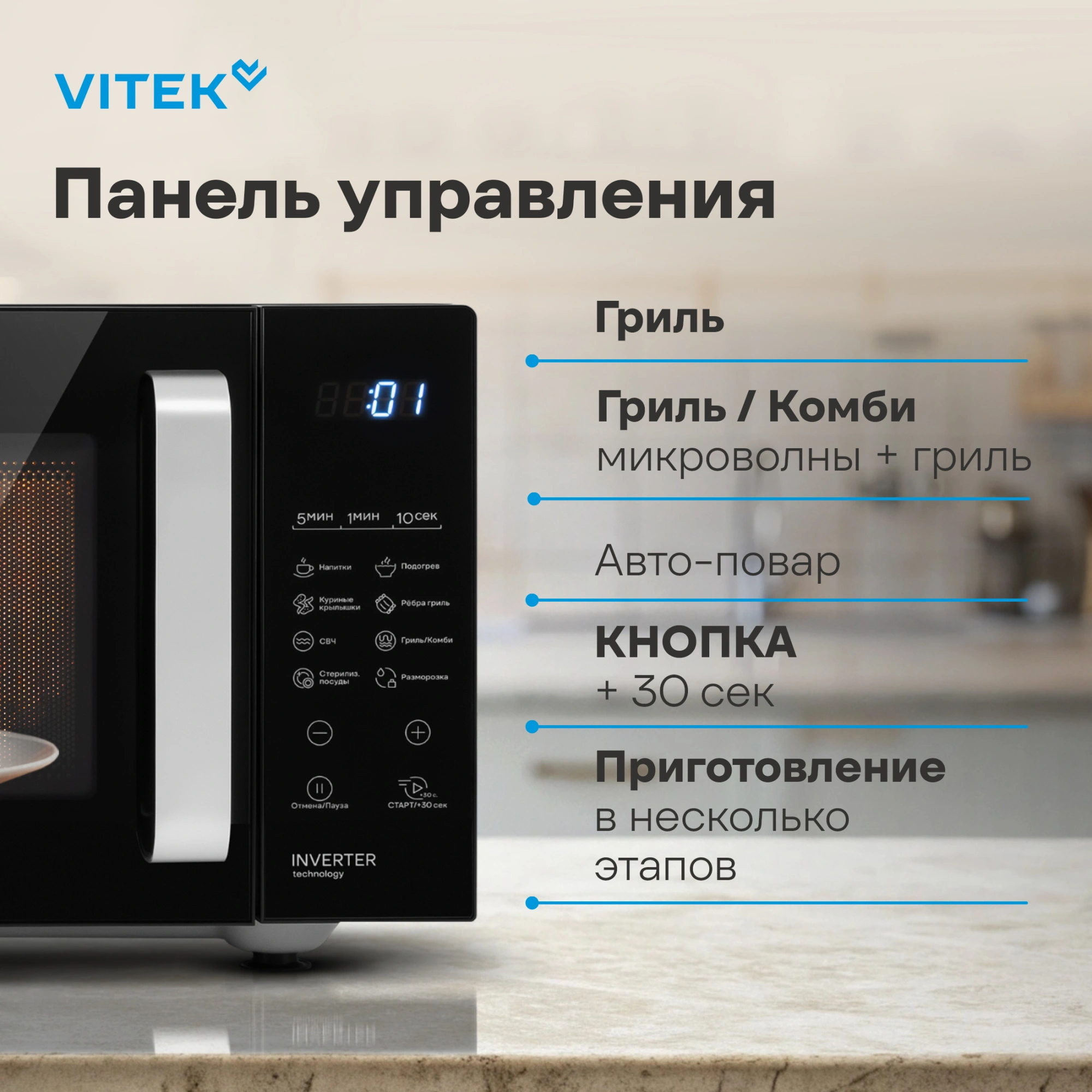 Vitek VT-MW2123 — инверторная микроволновая печь с грилем, рассчитанная на объем 23 л и выходную мощность микроволн 900 Вт. Инвертор плавно регулирует подвод энергии без резких импульсов, поэтому разогрев и разморозка проходят равномерно, соусы не «вскипают» по краям, а блюда не пересушиваются. Плоское дно без поворотного диска дает больше полезного места для прямоугольных форм и контейнеров, еда прогревается стабильно по всей площади. Камера освещается изнутри, полноразмерная стеклянная дверца и дисплей белого свечения с часами упрощают контроль. Широкая серебристая ручка удобна при ежедневном использовании, черный корпус аккуратно смотрится в современной кухне.