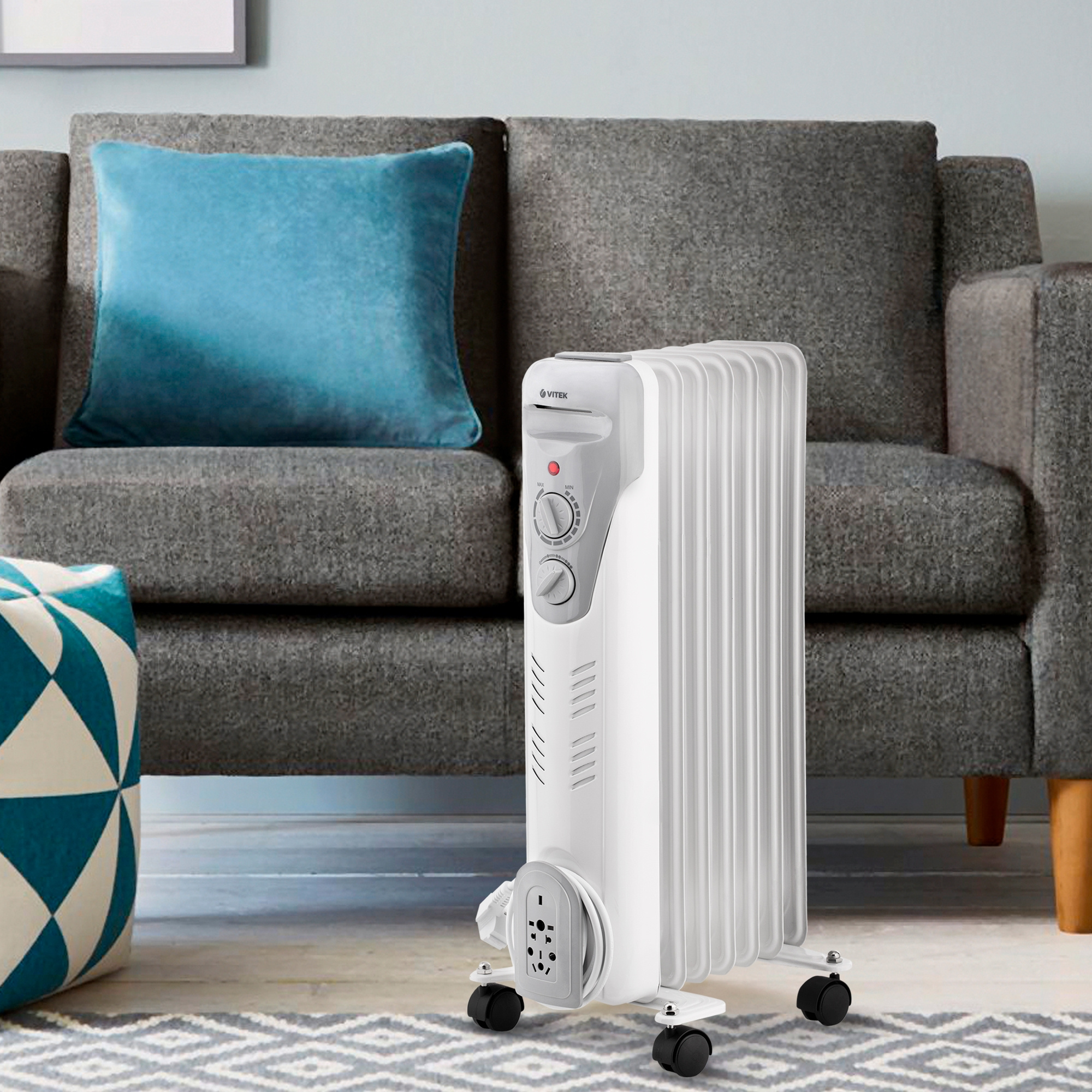 Там, где радиатор VITEK VT-1708 – всегда тепло и уют. 7 секций и мощность 1500 Вт быстро поднимут температуру воздуха в помещении до 20 кв. м. При этом специальные термические щели обеспечат равномерную циркуляцию теплого воздуха, так что его температура будет одинаковой и у пола, и у потолка. Пользоваться радиатором просто и удобно – достаточно выбрать нужную мощность и плавно отрегулировать температуру с помощью тумблера термостата. Обогреватель оснащен колесиками и ручкой для перемещения, что вкупе с небольшим весом и компактными размерами делает его очень маневренным и легким в перемещении. Контролировать состояние радиатора вам поможет специальный индикатор, а функция отключения при перегреве или опрокидывании предотвратит возможные неприятности, если вы вдруг забудете вовремя отключить прибор.