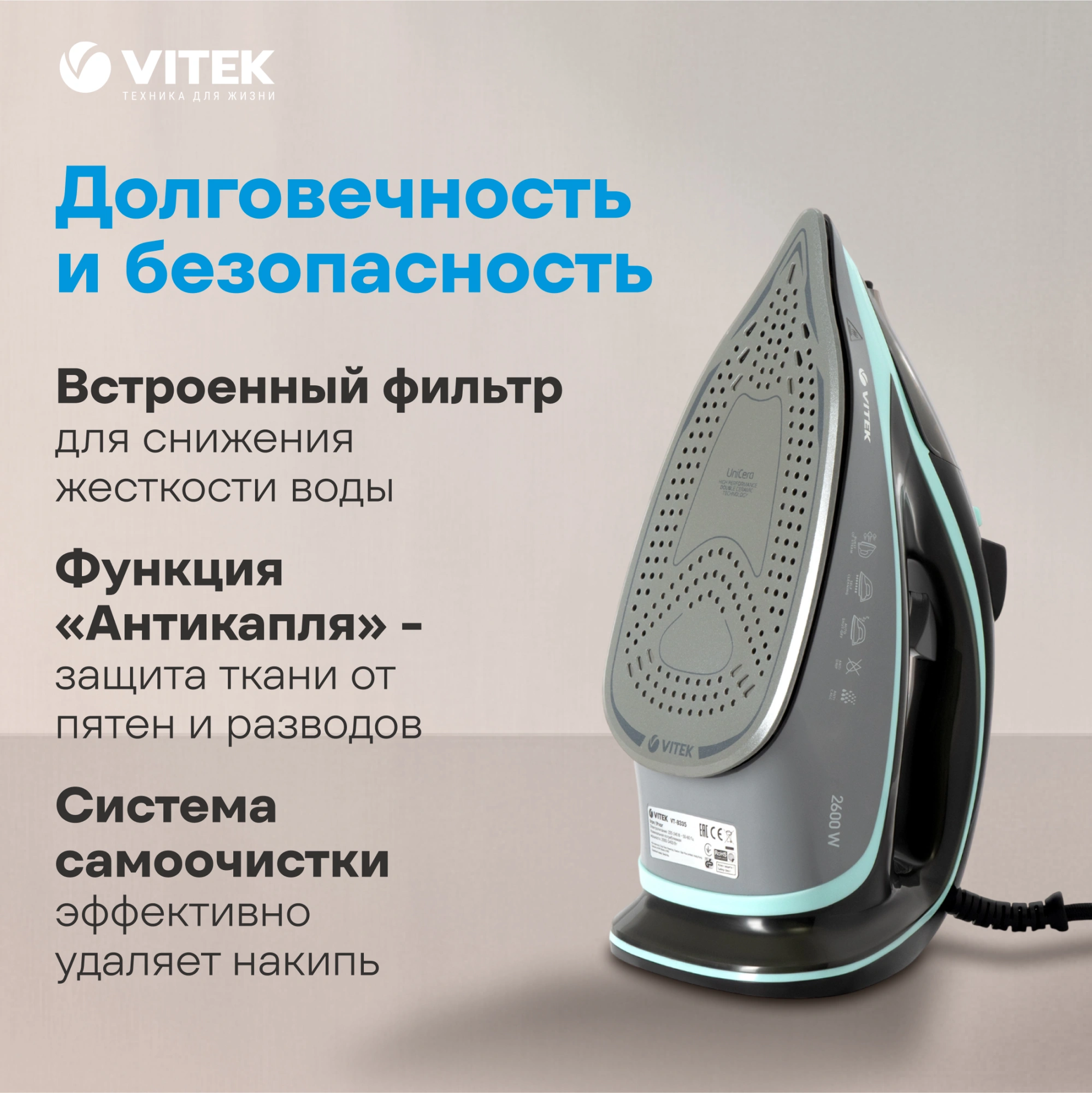 Утюг VITEK VT-8335 обладает множеством полезных функций и превратит глажку в удовольствие. МодельVT-8335 с максимальной мощность 2600 Вт поможет быстро и легко погладить постельное белье или привести вещи в порядок. Подошва утюга имеет двойное керамическое покрытие UniCera, которое обеспечивает беспрепятственное движение утюга в любом направлении без образования складок и вытягивания ткани. В режиме отпаривания утюг очень эффективен: паровой удар в 145 г/мин гарантирует идеальный результат. Встроенная защита от накипи, а также система самоочистки и функция «Антикапля» способствуют особому комфорту в использовании прибора. Вместительный резервуар позволит максимально долго гладить без долива воды.