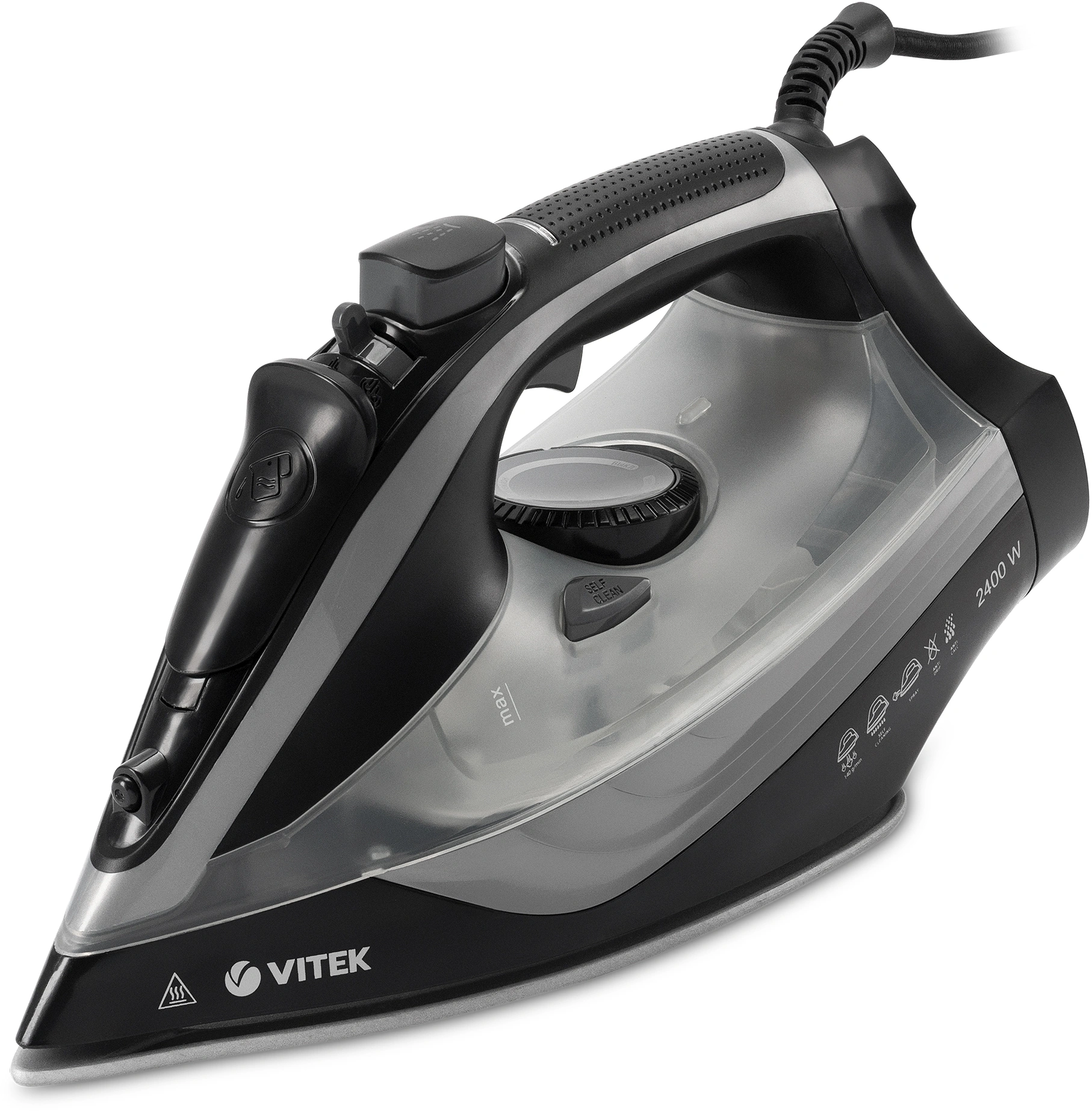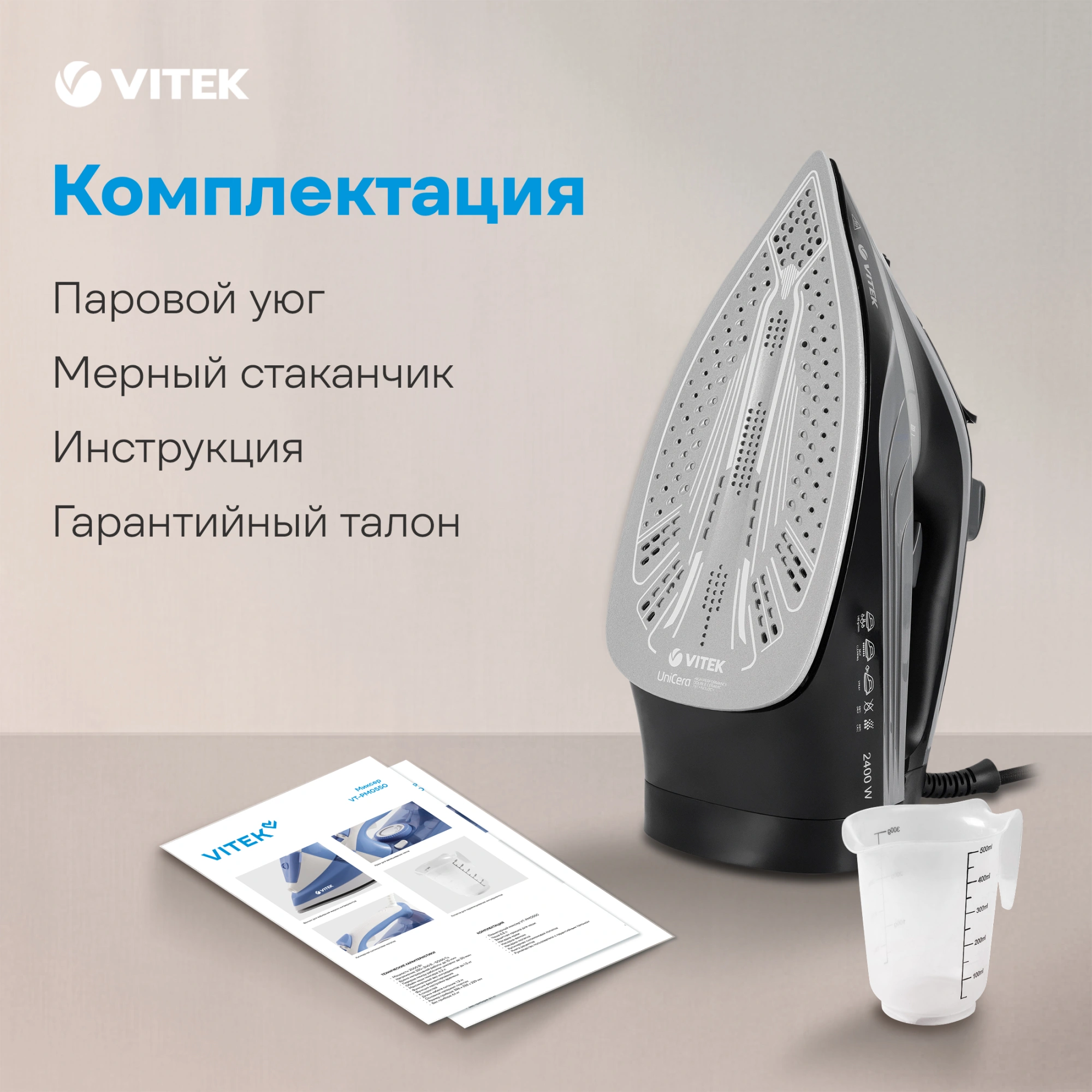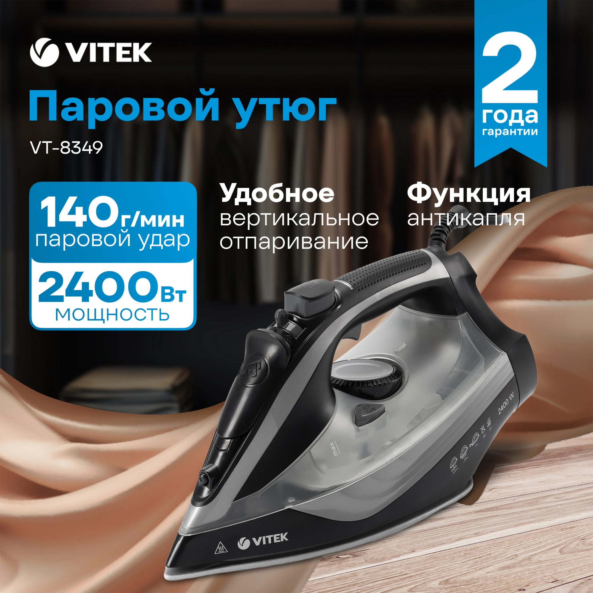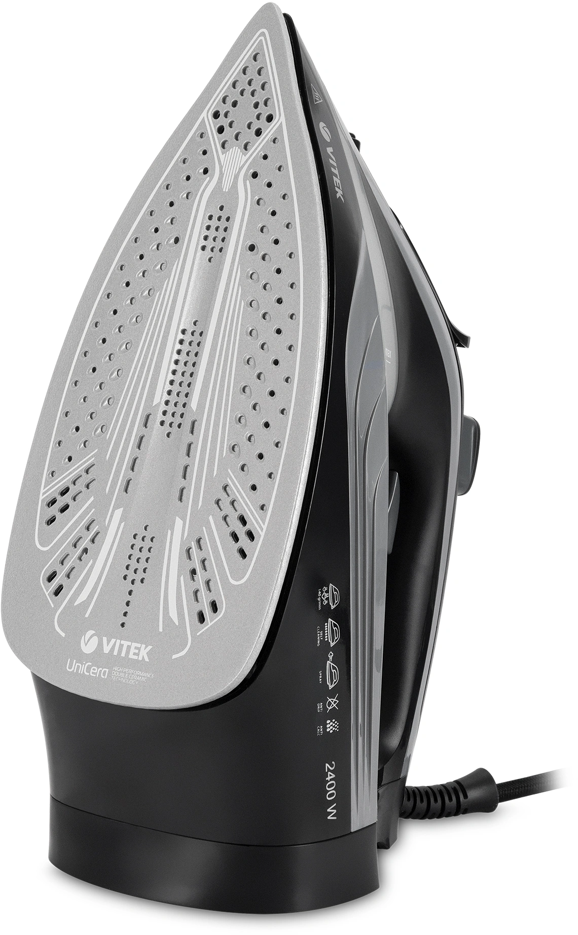 Утюг VITEK VT-8349 с максимальной мощностью 2400 Вт поможет быстро и легко привести в порядок вашу одежду. Подошва прибора имеет уникальное двойное керамическое покрытие UniCera, которое обеспечивает легкое скольжение по любому виду ткани. При наличии серьезных заломов на ней можно воспользоваться функцией разбрызгивания. В режиме отпаривания утюг очень эффективен: паровой удар в 140 г/мин гарантирует идеальный результат. Встроенная защита от накипи, а также система самоочистки и функция «Антикапля» способствуют особому комфорту в использовании прибора. Купите утюг VITEK VT-8349 и получайте удовольствие от обычной заботы о вещах!