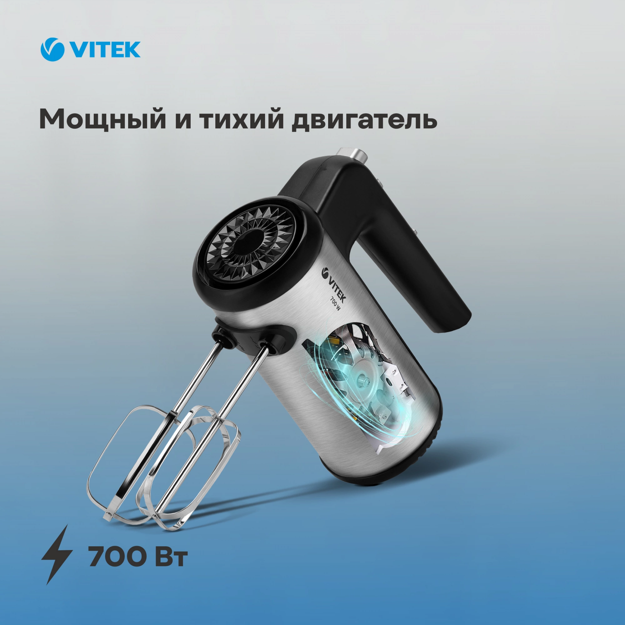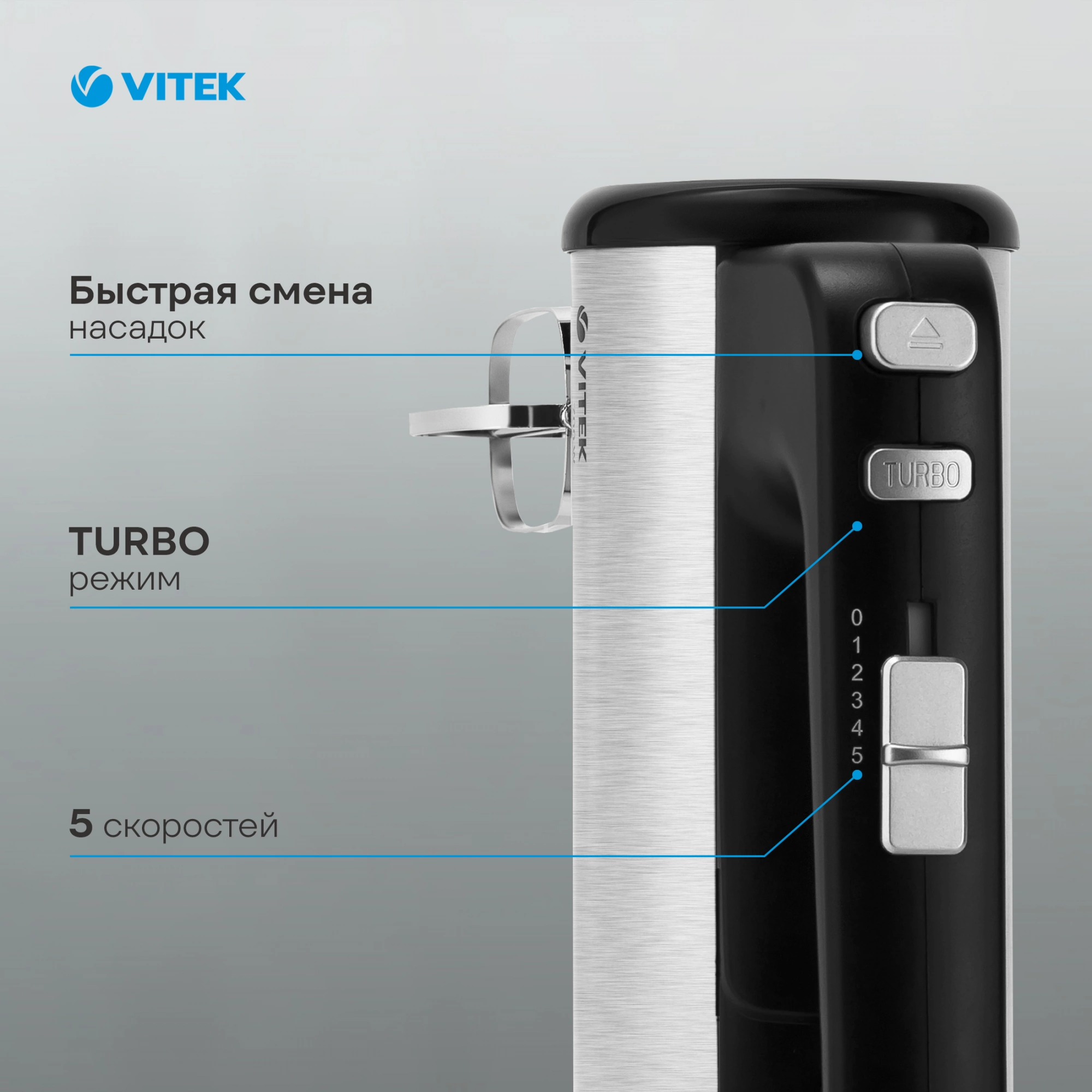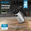 Миксер VITEK VT-1411 с максимальной мощностью 700 Вт позволит взбить в крепкую пену яичные белки, приготовить воздушный мусс или нежнейший крем для торта, а также идеально вымесить тесто. Прибор имеет 5 скоростных режимов и режим «Турбо», который поможет быстро справиться с самой густой массой. В комплект входят венчики для взбивания и насадки для теста из хромированной стали, гарантирующей прибору долгий срок службы. Менять насадки очень просто — легким нажатием на специальную кнопку.
