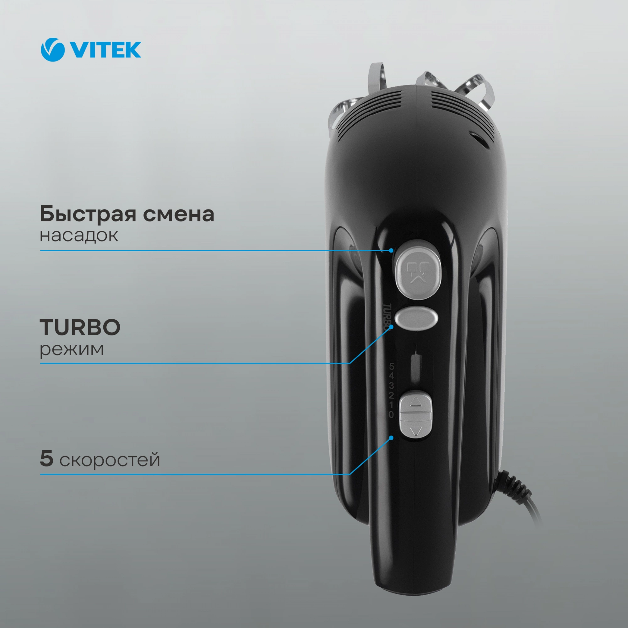 Для тех, кто обожает кулинарное творчество, миксер VITEK VT-1481 с максимальной мощностью 800 Вт станет отличным помощником. Прибор имеет пять скоростных режимов, позволяющих точно следовать рецептам для достижения идеального результата. Первый, например, подходит для смешивания сухих ингредиентов, а пятый — для взбивания яиц или ингредиентов сахарной глазури. Миксер также имеет режим «ТУРБО», который включается нажатием и удержанием соответствующей кнопки. В комплект входят два венчика для взбивания кремов, сливок, коктейлей и два крюка для замеса любого вида теста. Насадки легко снимаются с помощью кнопки, что улучшает скорость и качество пользования прибором. Купите миксер VITEK VT-1481: готовьте легко, просто, с настроением!